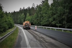 Pokračujeme v opravě téměř 11 kilometrů komunikace mezi Ostrovem nad Oslavou a Křižanovem, která počátkem července přešla do další fáze. Na průtahu Ostrovem n./O. i v úseku Skelné n./O.- Jívové (na obou místech pracujeme současně) jsme dokončili polovinu vozovky a přešli jsme na její druhou část, po které se doposud jezdilo. Práce na této části zahájilo frázování živičných vrstev a jejich očištění, následovat bude