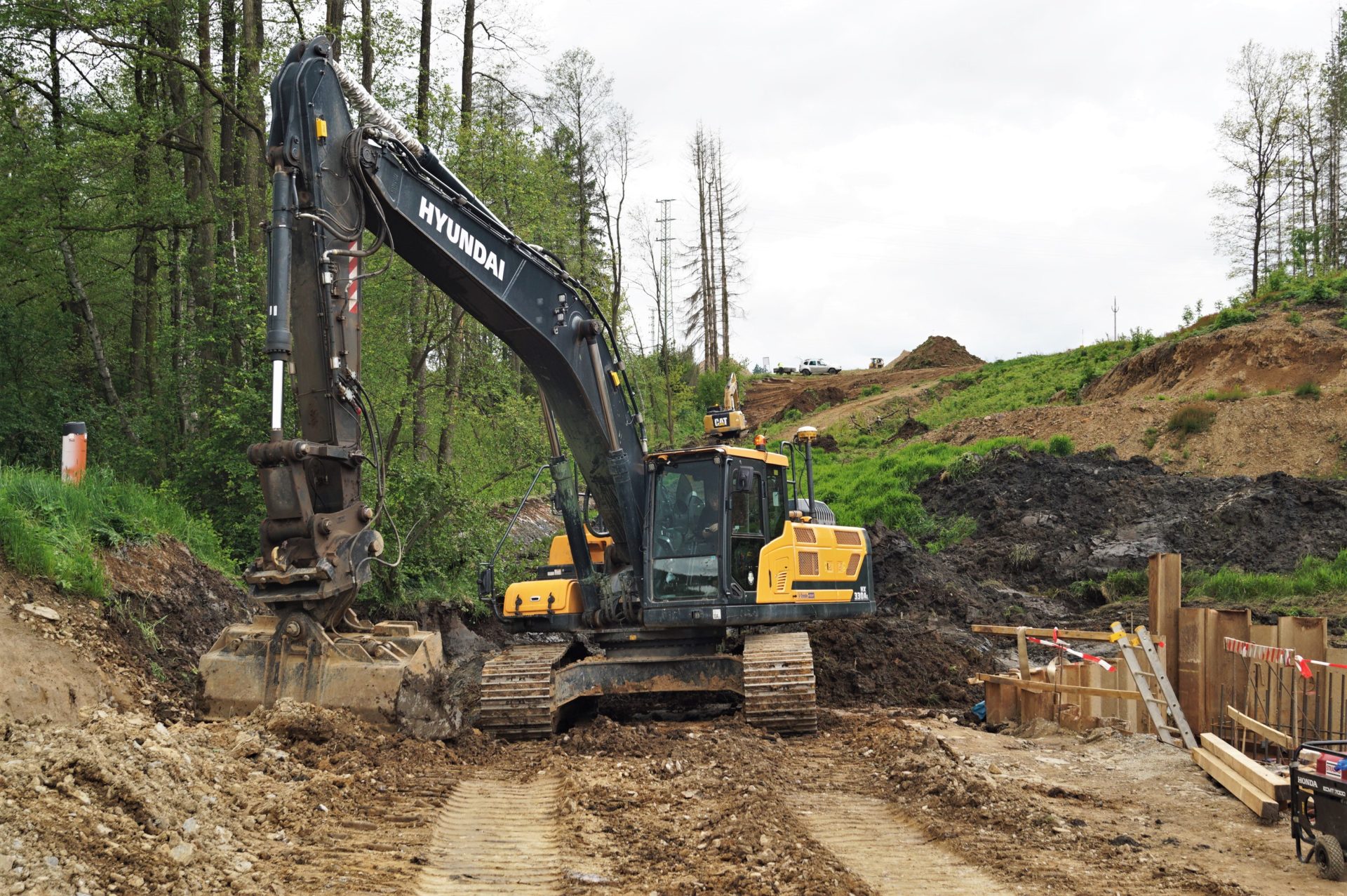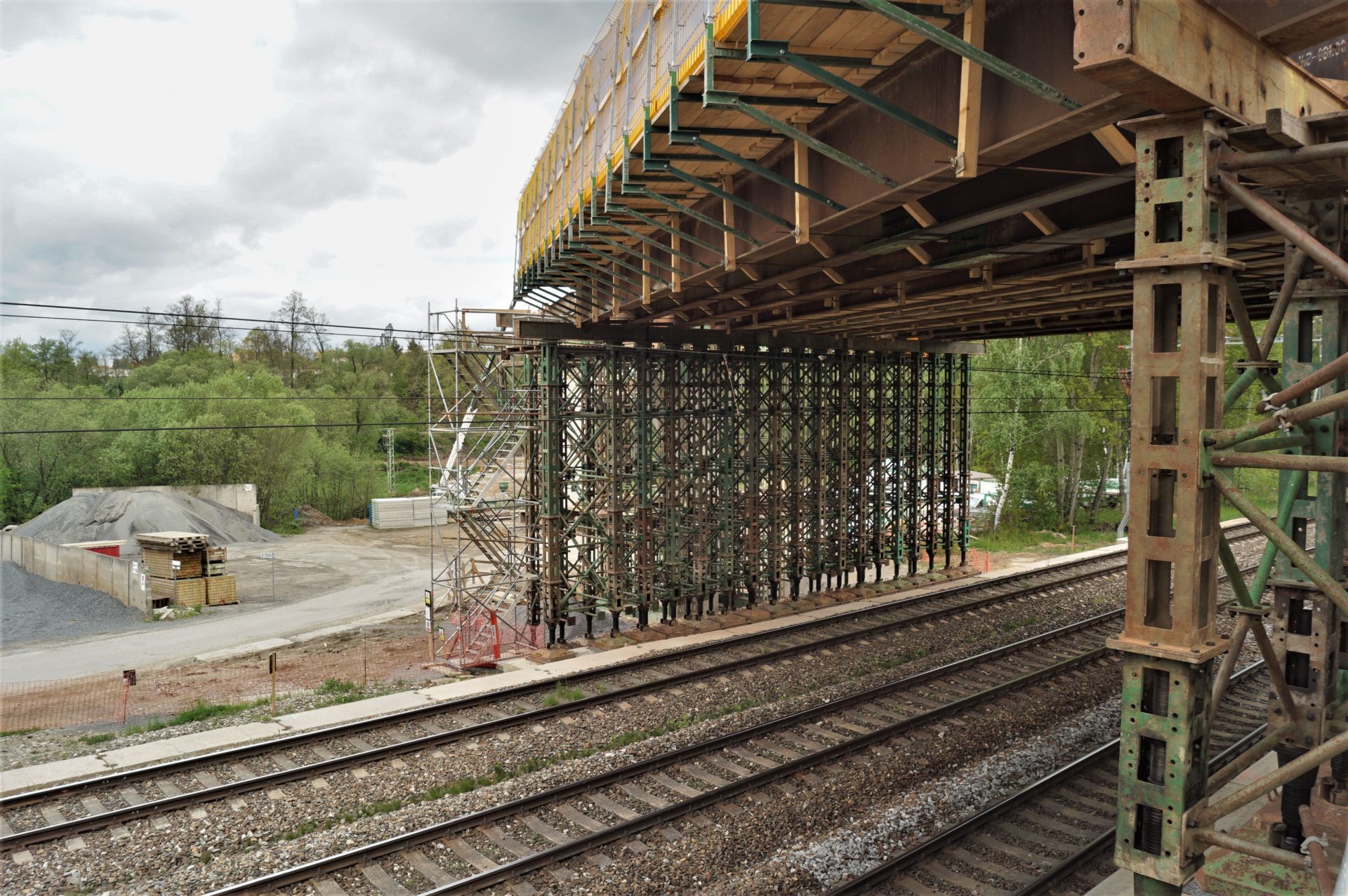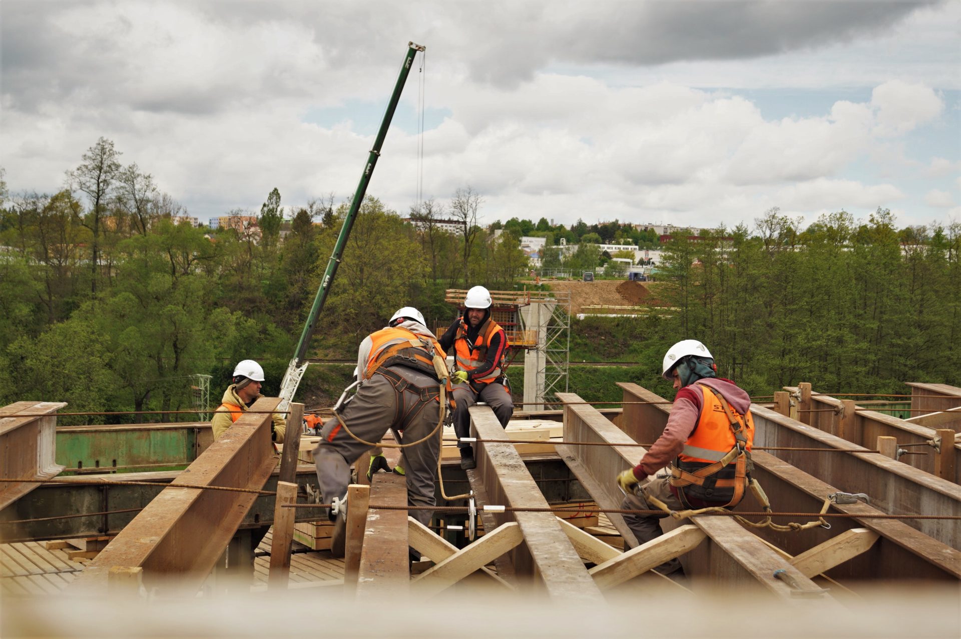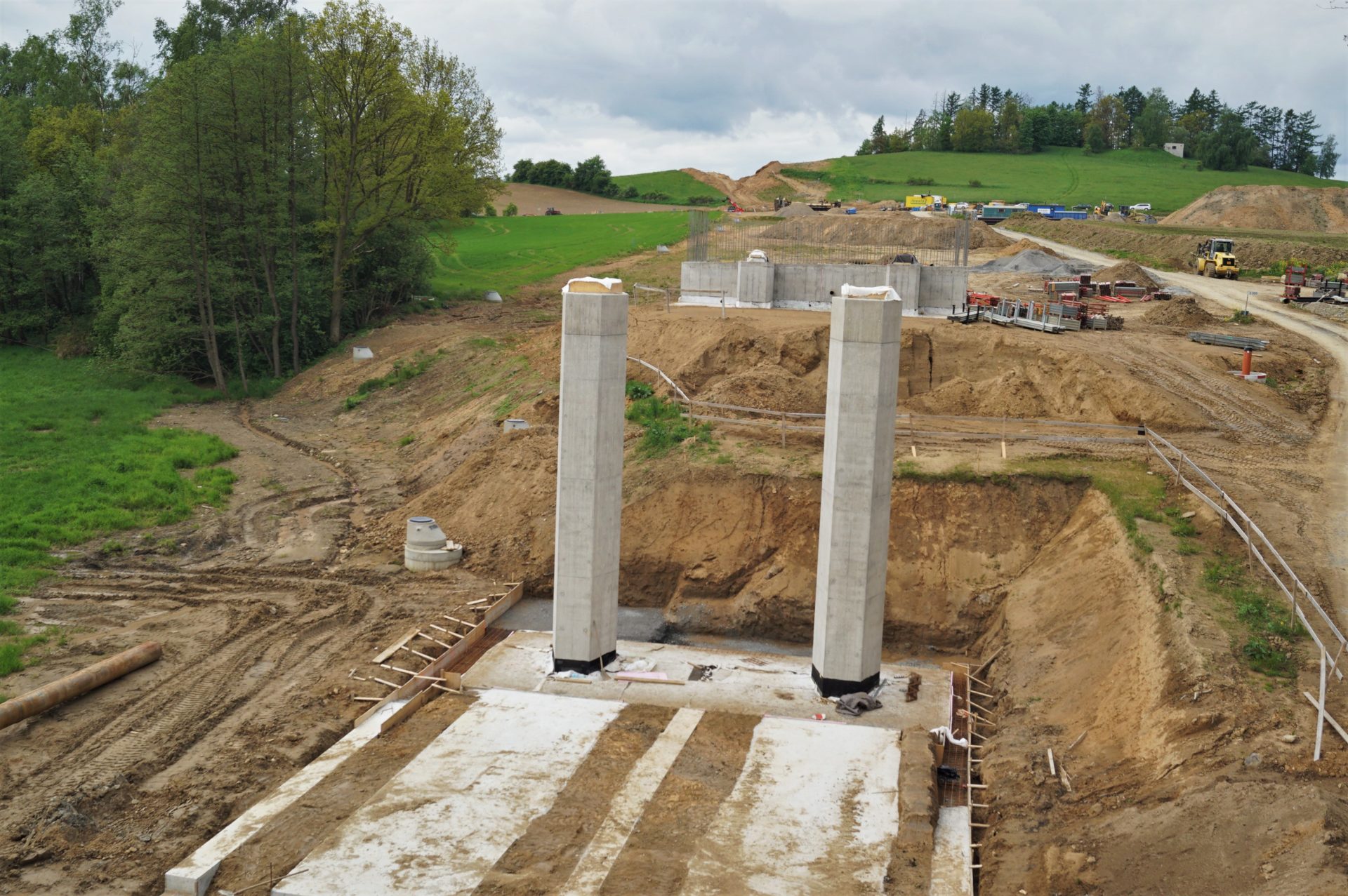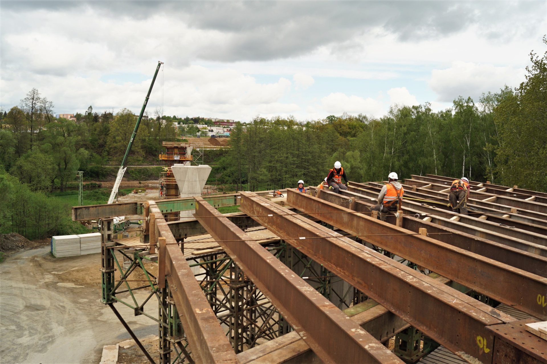 Na stavbě JV obchvatu Havlíčkova Brodu již znatelně rozeznáte nejen pilíře a opěry budoucích 7 mostů, ale pomalu se začíná rýsovat i pozemní komunikace v hlavní trase obchvatu. Prakticky na všech mostech se dokončuje betonáž dříků a hlavic pilířů a betonáž mostních opěr. Na mostě přes železniční trať Praha-Havlíčkův Brod-Brno, řeku Sázavu a železniční trať H. Brod-Chotěboř (SO 201) se pokračuje již také v přípravě hlavní nosné konstrukce přes trakční vedení tratě H. Brod-Brno a to za jejího plného provozu. Betonáž prvního pole hlavní nosné konstrukce je dokončena na mostě přes Stříbrný potok a v minulém týdnu probíhalo předpínání nosné konstrukce tohoto pole.