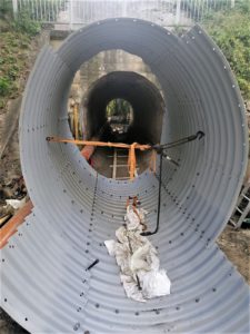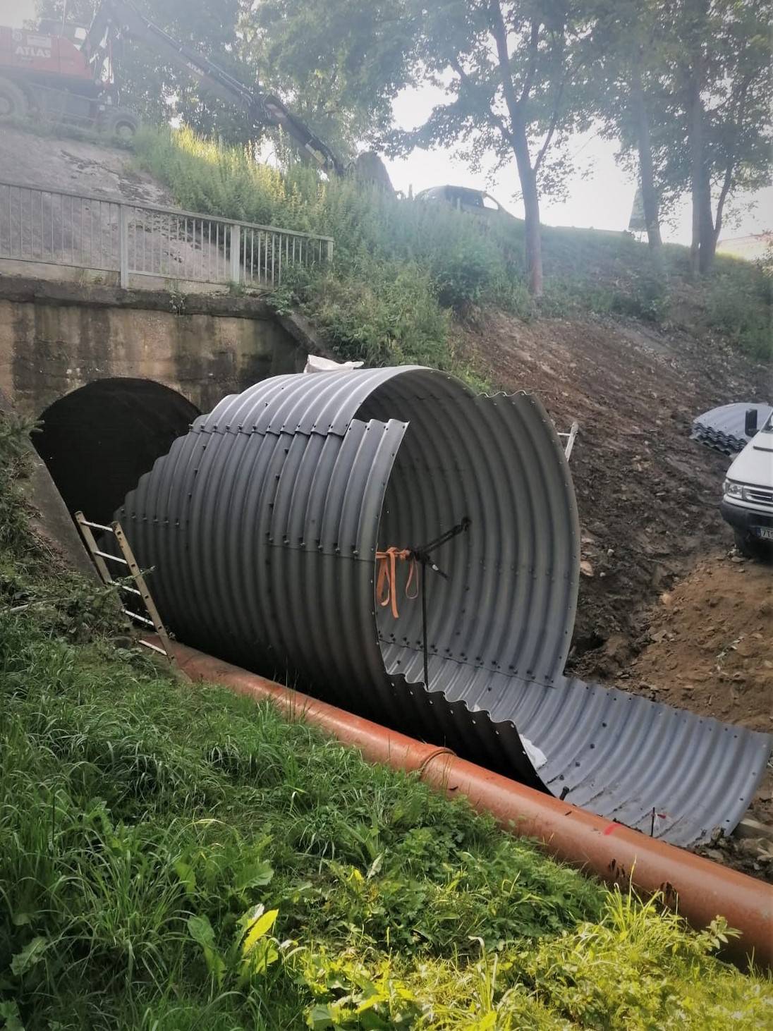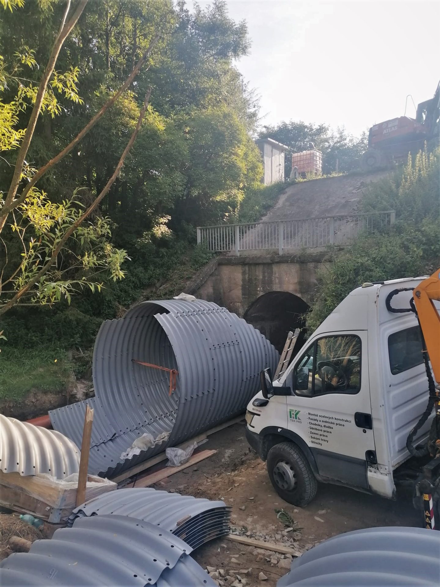 Po jeho postupném zasunutí přijde na řadu výplň prostoru mezi ním a stávající klenbou betonem a zpevnění koryta v tubosideru lomovým kamenem do betonu. Tyto práce budou probíhat nejméně do konce srpna, kdy řidiči musí počítat v omezení (zázemí staveniště) i se zvýšeným pohybem těžké techniky.