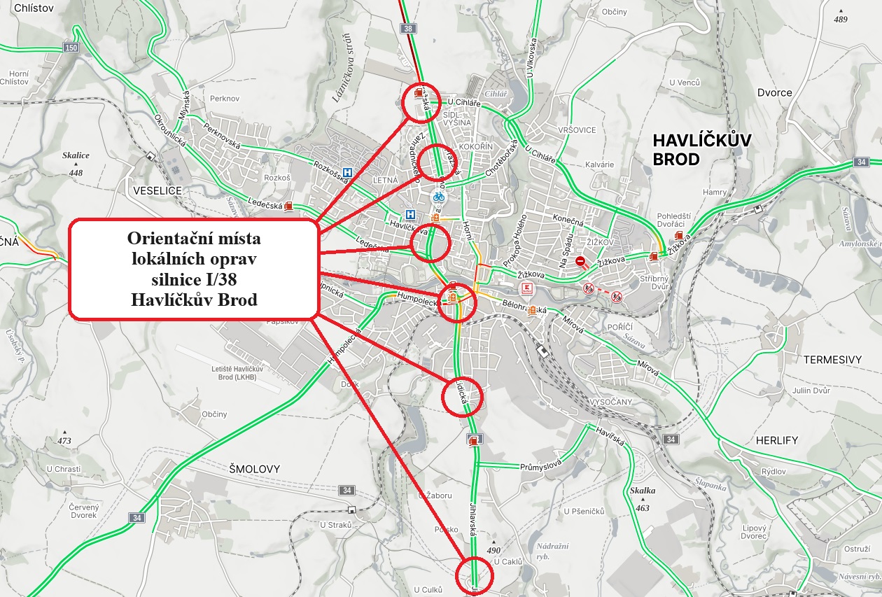 V tomto termínu dojde k lokální opravě výtluků hned na několika úsecích silnice I/38 procházející městem Havlíčkův Brod. Konkrétně jde o ulice Lidická, Masarykova a Pražská.