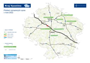 Mapa významných oprav na komunikacích ve správě ŘSD ČR ukazuje stavební akce, které probíhají či probíhaly v průběhu měsíce října 2022 v Kraji Vysočina. V mezidobí jsme ulevili obyvatelům Žďáru nad Sázavou dokončením opravy silnice I/37 na průtahu městem. V polovině měsíce jsme také uvedli do provozu opravený pravý jízdní pás jihlavského přivaděče na silnici I/38 a před dokončením jsou rovněž mosty na téže silnici u Vílance.