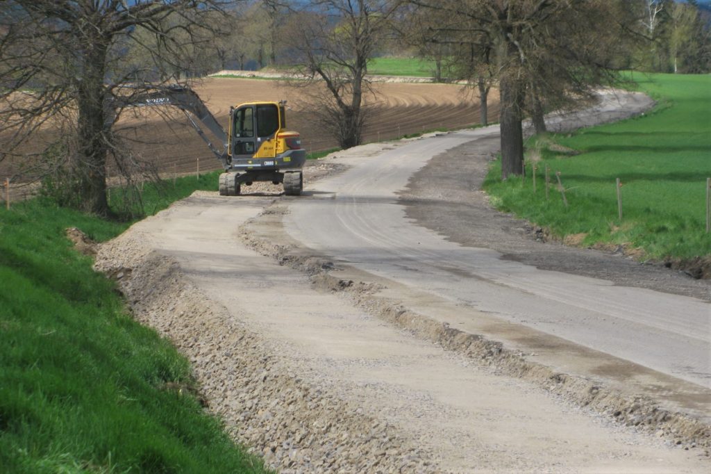 Zatím jsme v průběhu prací seřízli zvýšené nezpevněné krajnice a zahájili odkop a sanaci okraje vozovky v jednom směru jízdy. V průběhu května budeme pokračovat v odkopu a sanaci okrajů i na druhé straně vozovky (zavážení lomovým kamenem a štěrkodrtí, hutnění a dosypávaní krajnic). Souběžně v návaznosti na sanaci okrajů se bude realizovat odvodnění pomocí drenáží a v obci začištění okrajů po frézování. To vše v rámci příprav na recyklaci za studena, která přijde na řadu na přelomu měsíce května a června. veškeré práce zatím probíhají v souladu se schváleným harmonogramem, tak že s pokládkou první nové asfaltové vrstvy počítáme v druhé polovině června.