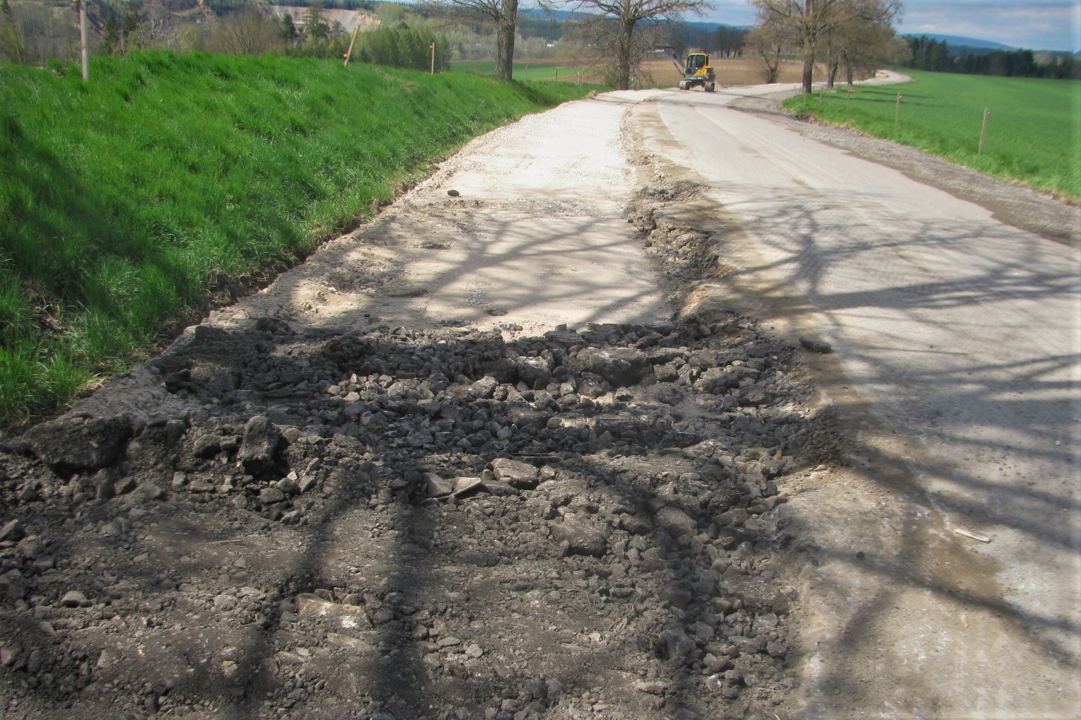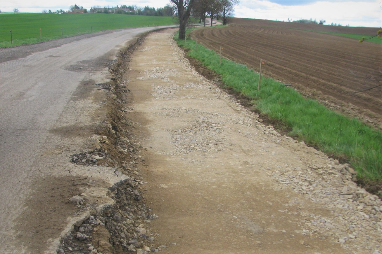 Zatím jsme v průběhu prací seřízli zvýšené nezpevněné krajnice a zahájili odkop a sanaci okraje vozovky v jednom směru jízdy. V průběhu května budeme pokračovat v odkopu a sanaci okrajů i na druhé straně vozovky (zavážení lomovým kamenem a štěrkodrtí, hutnění a dosypávaní krajnic). Souběžně v návaznosti na sanaci okrajů se bude realizovat odvodnění pomocí drenáží a v obci začištění okrajů po frézování. To vše v rámci příprav na recyklaci za studena, která přijde na řadu na přelomu měsíce května a června. veškeré práce zatím probíhají v souladu se schváleným harmonogramem, tak že s pokládkou první nové asfaltové vrstvy počítáme v druhé polovině června.