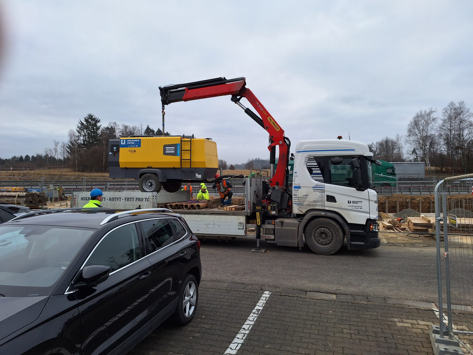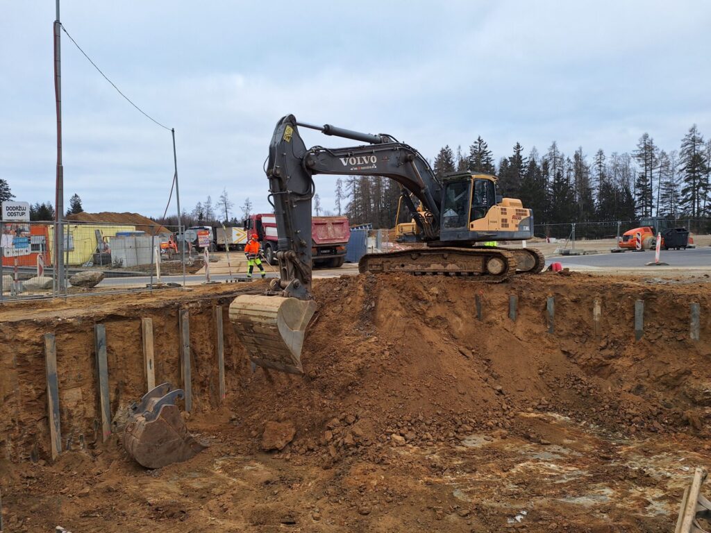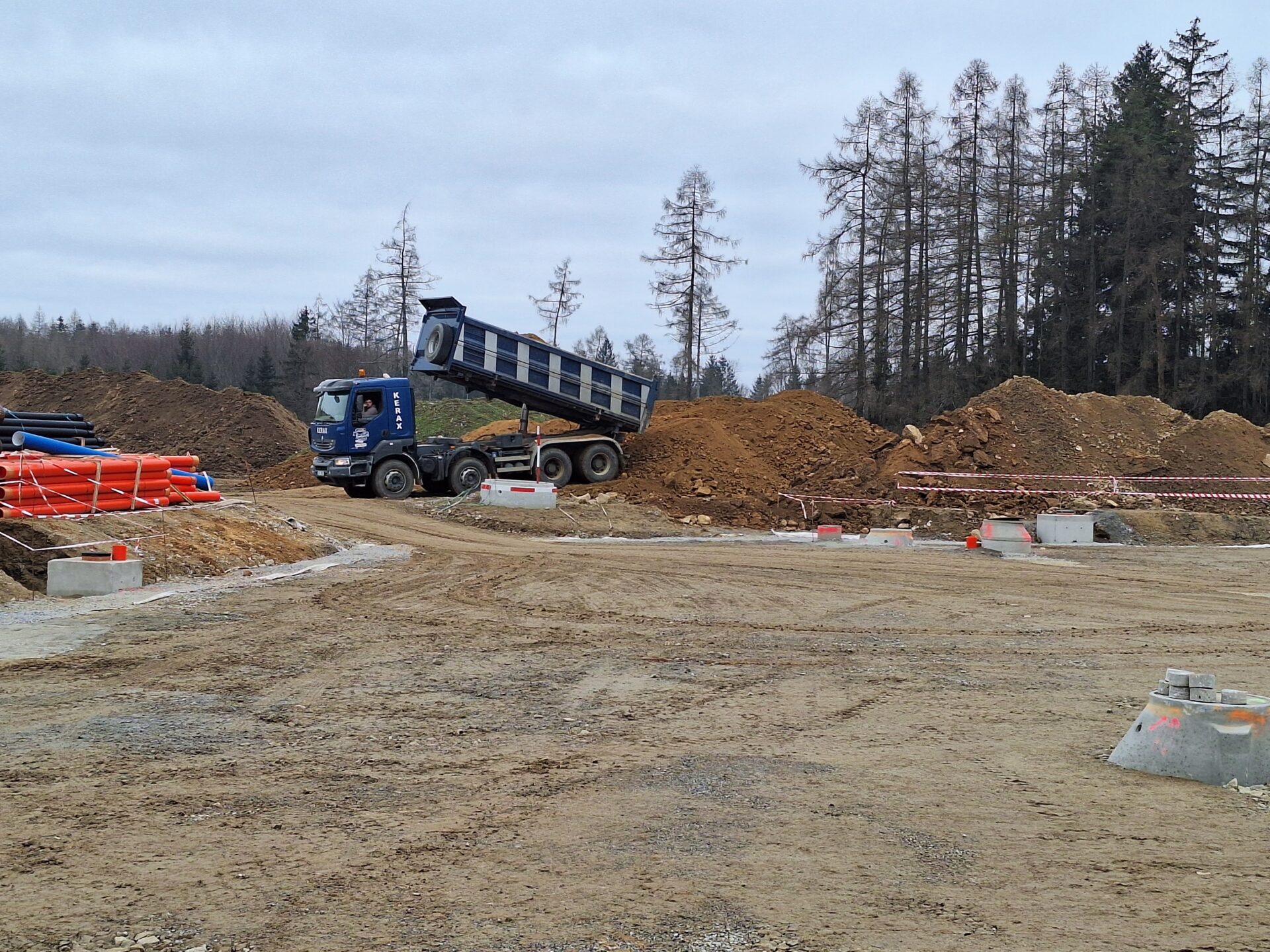 Stavební akce byla přerušena od konce prosince do začátku února. Nyní už se ale opět na plno rozeběhla, a to za mrazivých teplot, které na nejvýše položeném dálničním úseku v České republice nejsou touto dobou nijak výjimečné. Práce s promrzlou zeminou je ale náročná. Proto je také nasazení jak těžké techniky, tak lidských zdrojů maximální. Na straně směr Praha už byla v nově zabraném prostoru dokončena dešťová kanalizace. Nyní se intenzivně pracuje ve výseči mezi původní odpočívkou a dálničním tělesem. Zde je do cca 5 m hloubena jáma pro dešťovou usazovací nádrž. Na straně směr Brno je vidět také pokrok. Zde se nadále pracuje na rozšíření prostoru, který je do značné míry tvořen skalnatým podložím. Zároveň jsou usazovány betonové armatury nového systému odvodnění.