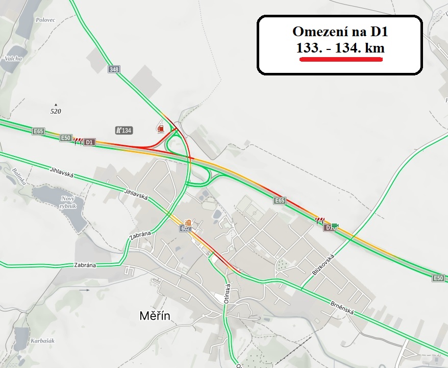 Od neděle 6. 8. 2023, 10:00 hod. až do 26. 8. 2023, 14:00 hod. bude uzavřen pravý pás dálnice v km 133,450–134,095 vč. výjezdové větve MÚK Měřín (EXIT 134) vpravo a provoz bude veden v provizorních jízdních pruzích v režimu 2+2/0.
