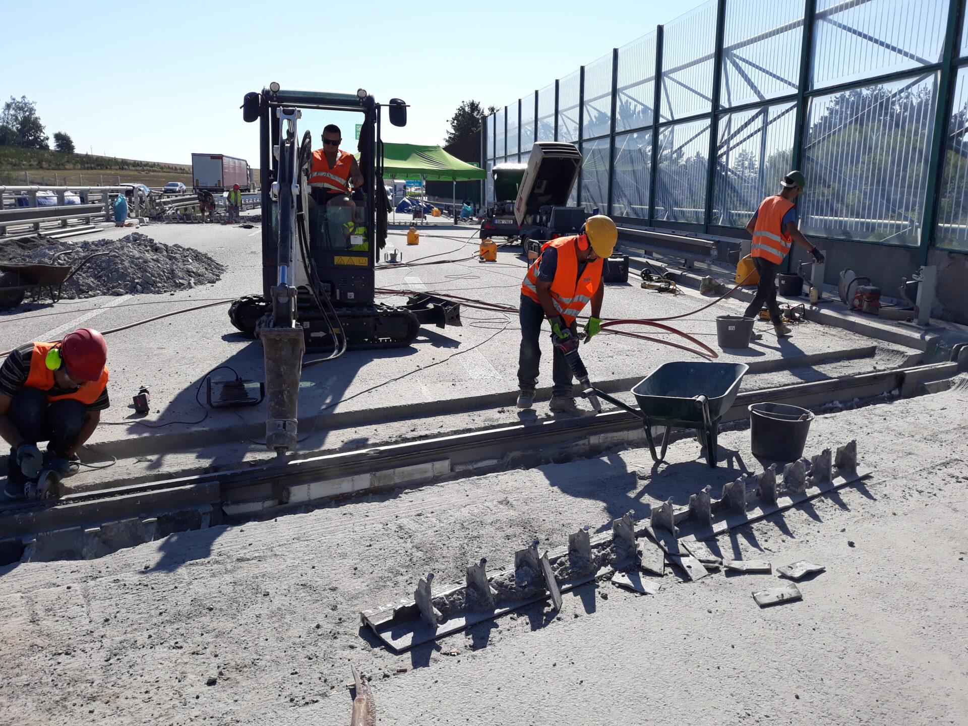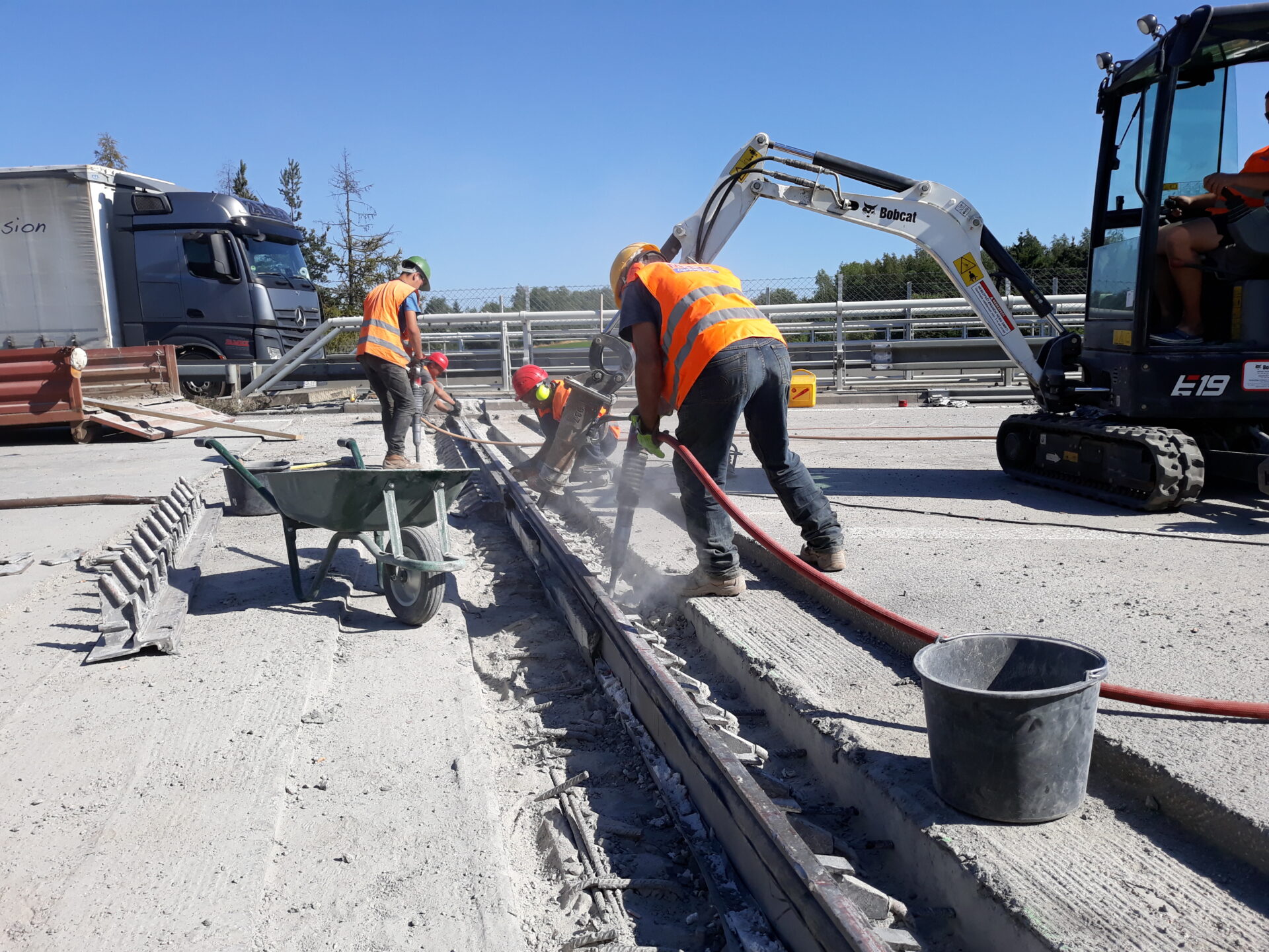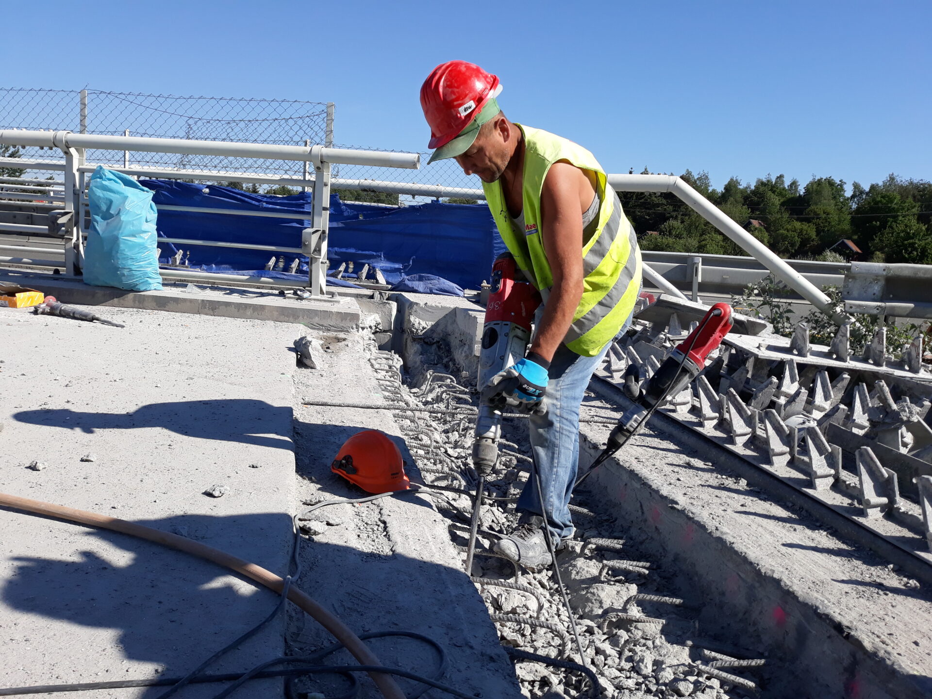 Stávající mostní závěry budou postupně vybourány a nahrazeny novými povrchovými závěry s odpovídající dilatační schopností. Čety pracovníků se aktuálně snaží se sbíječkami odstranit beton, aby bylo možné již nevyhovující mostní závěry vyjmout z mostní konstrukce a nahradit je novými. Práce běží nonstop, tedy nejen v denních, ale i v nočních hodinách.