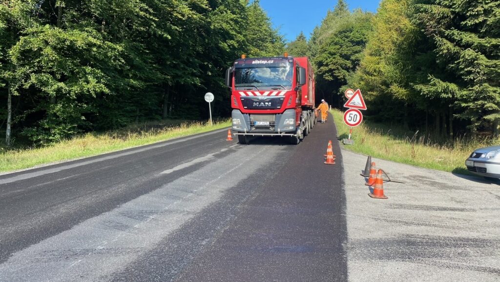 Na silnici I/19 u Radňovic na Žďársku dokončujeme pokládku mikrokoberce a protismykové vrstvy. Cesta zde bude pro motoristy bezpečnější.