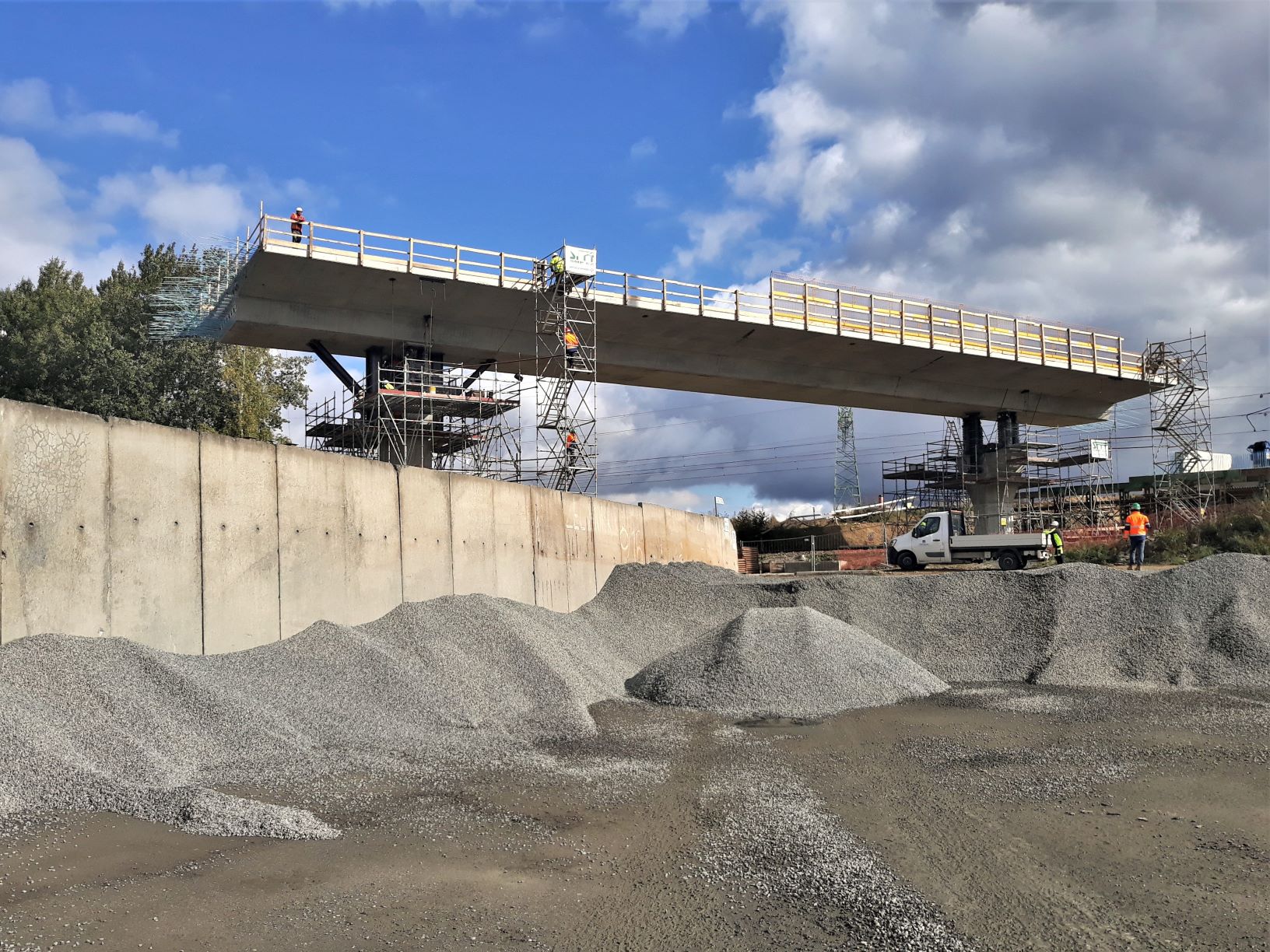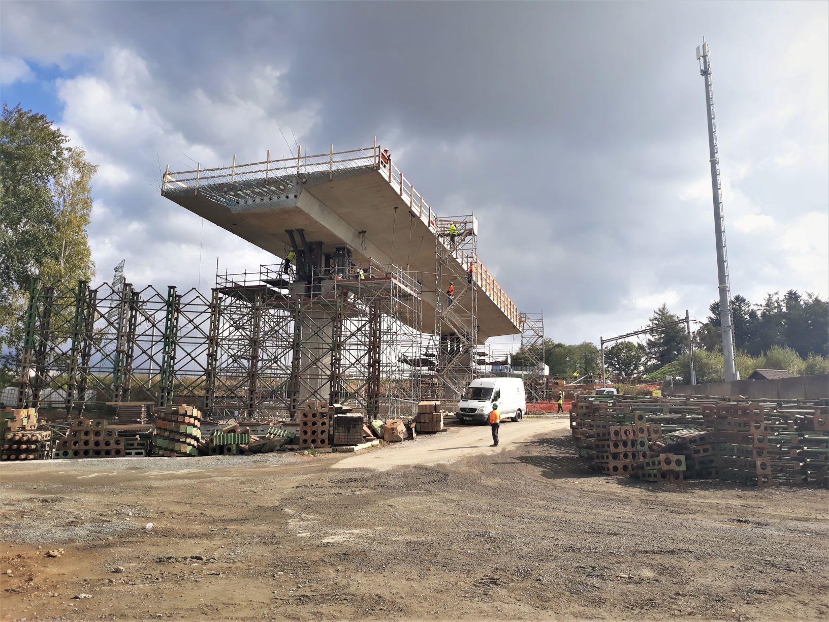 Po dokončené betonáži závěrem srpna, jsme 12.10. 2021 přistoupili k postupnému snášení tohoto pole o šířce 14 metrů, délce mezi pilíři 37 metrů a celkové snášené délce 54 metrů. Tuto železobetonovou konstrukci o váze 1700 tun je třeba umístit do projektové výšky, která je o 1,5 metrů níže, tedy 0,5 metrů nad trakcí železnice. Děje se tak pomocí 4 instalovaných speciálních hydraulických pístů na pilířích, na než tato část mostu dosedne. Spouštění po 15 centimetrech na každé straně je plánované na 3 dny a ve čtvrtek 14.10. se spodní strany nosné konstrukce přiblíží k hlavicím mostních pilířů. Před úplným dosednutím budou na pilíře instalovány ložiska, na která teprve nosná konstrukce definitivně dosedne. Předpokládáme, že letos ještě proběhne betonáž navazujícího pole k mostní opěře OP9 a zbytek hlavní nosné konstrukce zbývajících 6 polí dokončíme v průběhu příštího roku.