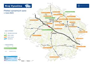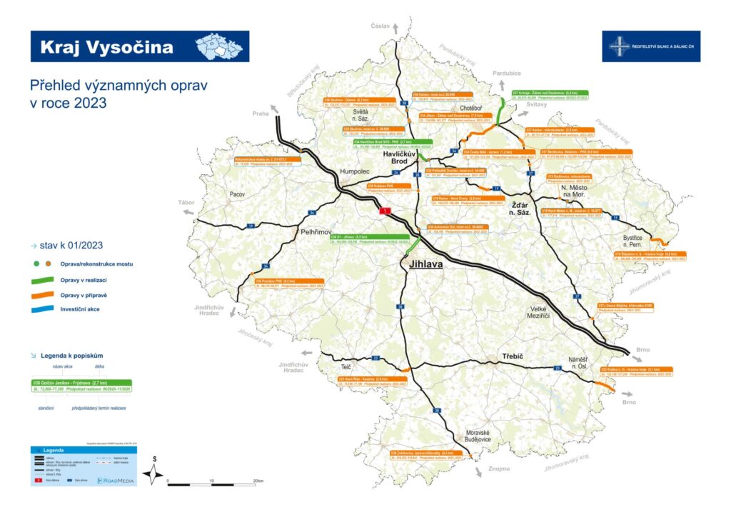 Pro letošní stavební sezónu je v přípravě 20 stavebních akcí na dálnici D1 v úseku Kraje Vysočina a na všech 5 silnicích I. tříd, které krajem prochází. Nejvíce by se mělo pracovat na silnici I/38, kde jich je v přípravě 6 a k nimž přistupuje dokončení opravy jihlavského dálničního přivaděče v jeho levém jízdním pásu. Dokončovat se v letošním roce budou ještě další 2 opravy započaté v roce 2022. Konkrétně se jedná o opravu povrchu komunikace I/37 a jejího odvodnění mezi Ždírcem nad Doubravou a hranicí s Pardubickým krajem a realizace protihlukových opatření v úseku SV obchvatu Havlíčkova Brodu na sil. I/34.