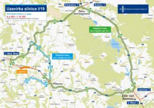 Práce probíhají za úplné uzavírky silnice I/19 a doprava je převedena na značené objízdné trasy viz. mapka. Objízdná trasa pro vozidla nad 3,5 tuny je vedena po silnicích I. tříd I/34 a I/37. Uzavírka je plánovaná do 7.8. 2021, kdy by mělo dojít k uvedení této části komunikace do provozu v režimu předčasného užívání stavby. V opravách však budeme pokračovat i po opětovném uvedení do provozu, kdy již jednotlivé činnosti budeme realizovat v rámci posuvného pracovního místa. Hotovo by mělo být v druhém říjnovém týdnu.