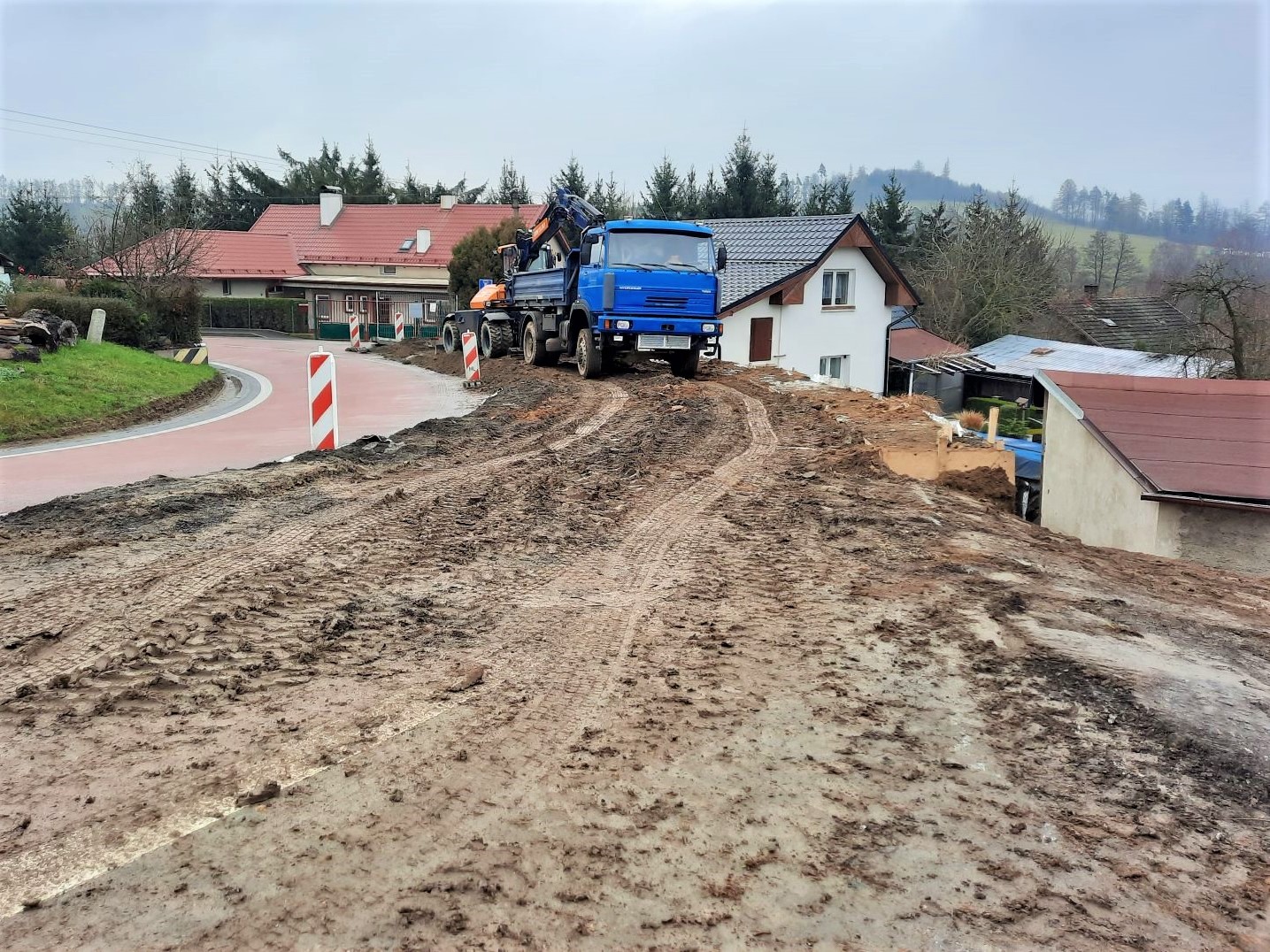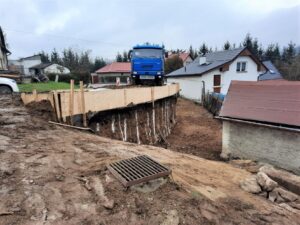 Na silnici I/19 ve Stříbrných Horách na Havlíčkobrodsku stále pokračujeme v zajištění násypového tělesa silnice I/19. Vyvrtali jsme a vybetonovali jsme 38 pilot, které tvoří základ budované pilotové opěrné zdi v délce 25 metrů. Dokončení jejich betonáže nám umožnilo realizovat bednění a betonáž římsy a v minulém týdnu provést výkopové práce na líci zdi a odtěžit terén na líci zdi po úroveň paty svahu.