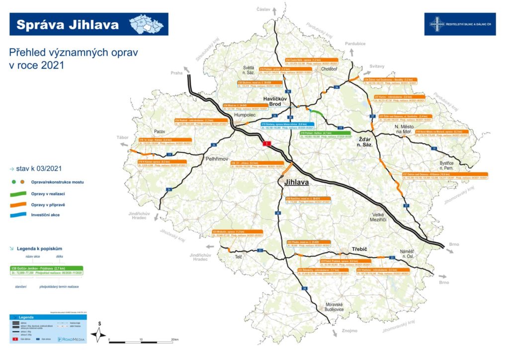 V současné době je ve finální fázi výběrové řízení na zhotovitele akce „I/37 Ostrov nad Oslavou – Křižanov“ v předpokládané hodnotě 95,9 mil. Kč bez DPH. Vybíráme z 9 nabídek, které nám byly k 10.3. zaslány, přičemž nejnižší nabídková cena je 81,2 mil. Kč bez DPH s dobou uvedení do provozu 19 týdnů. Mezi Ostrovem n./O a Křižanovem budeme opravovat 3 úseky silnice I/37 v celkové délce 10,6 kilometrů. Jedná se o úseky, které jsou již podle výsledků provedeného diagnostického průzkumu v nevyhovujícím nebo havarijním stavu s množstvím poruch různého charakteru. Zatím předpokládáme zahájení nejpozději v průběhu května. V průběhu května plánujeme zahájit také opravu silnice I/19 na průtahu Novým Městem na Moravě v ulici Brněnská. Od křižovatky s ulicí Masarykova směrem na Olešnou provedeme opravu obrusné vrstvy této komunikace v délce 300 metrů.