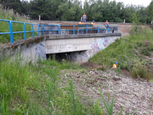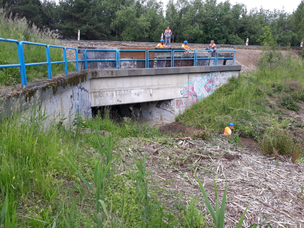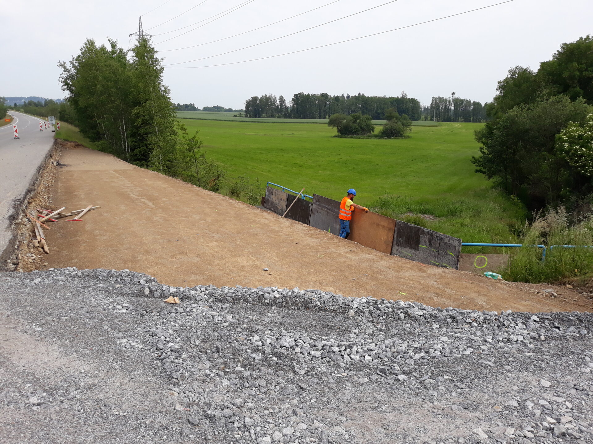 Momentálně probíhají terénní úpravy a veškerá činnost se soustřeďuje, a nadále bude soustřeďovat, pod samotným mostem. Čistíme koryto Pstružného potoka, který překlenuje, a na řadu přijde vyztužení mostu speciální konstrukcí, která zajistí navýšení jeho nosnosti na 900 tun.
