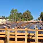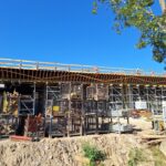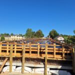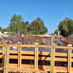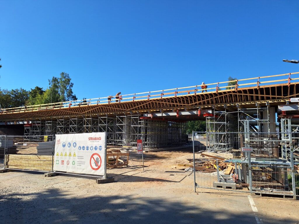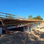 Spodní část mostu už je na svém místě. Jde o opěry, křídla a pilíře. Těžkou techniku v této fázi vystřídaly motorové pily, a hlavně kladiva a ruce. Na stavbě se denně podílí na 20 dělníků. Ti teď pracují na výstavbě nosné konstrukce, vrchní části mostu přenášející vozovku, kterou v tuto chvíli podepírá mohutné lešení. Vážou se zde ocelové výztuže a ze dřeva, desek, trámů a hranolů, se postupně sestavuje bednění. Vše se musí stihnout do prvního týdne v září, kdy je v plánu betonáž nosné konstrukce. Na tu bude použito okolo 550 kubíků betonu.