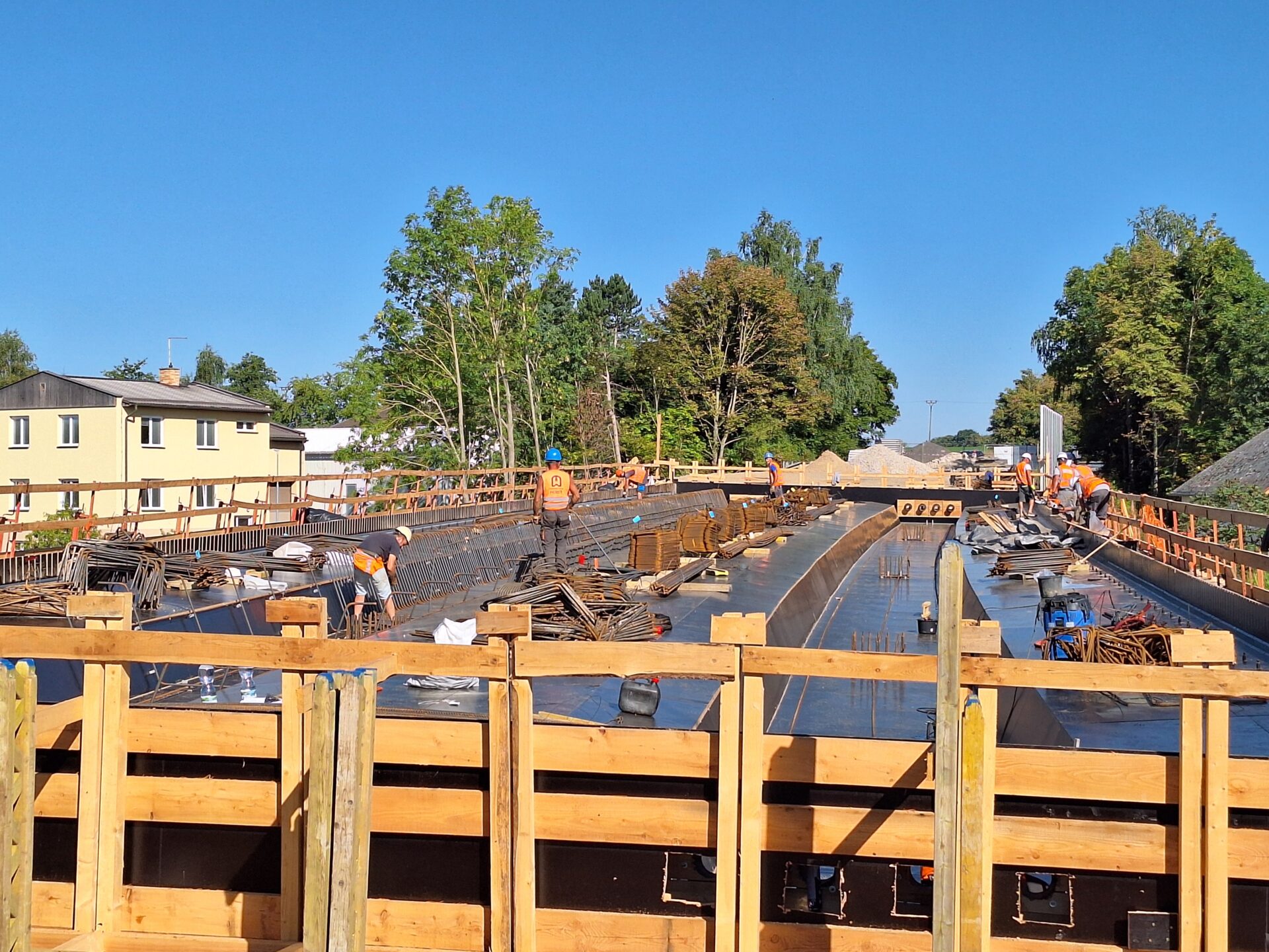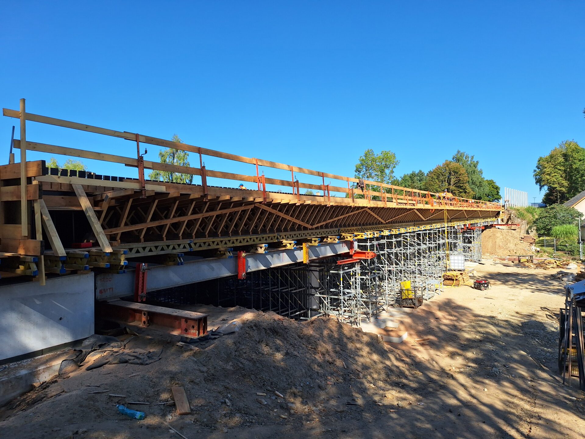 Spodní část mostu už je na svém místě. Jde o opěry, křídla a pilíře. Těžkou techniku v této fázi vystřídaly motorové pily, a hlavně kladiva a ruce. Na stavbě se denně podílí na 20 dělníků. Ti teď pracují na výstavbě nosné konstrukce, vrchní části mostu přenášející vozovku, kterou v tuto chvíli podepírá mohutné lešení. Vážou se zde ocelové výztuže a ze dřeva, desek, trámů a hranolů, se postupně sestavuje bednění. Vše se musí stihnout do prvního týdne v září, kdy je v plánu betonáž nosné konstrukce. Na tu bude použito okolo 550 kubíků betonu.