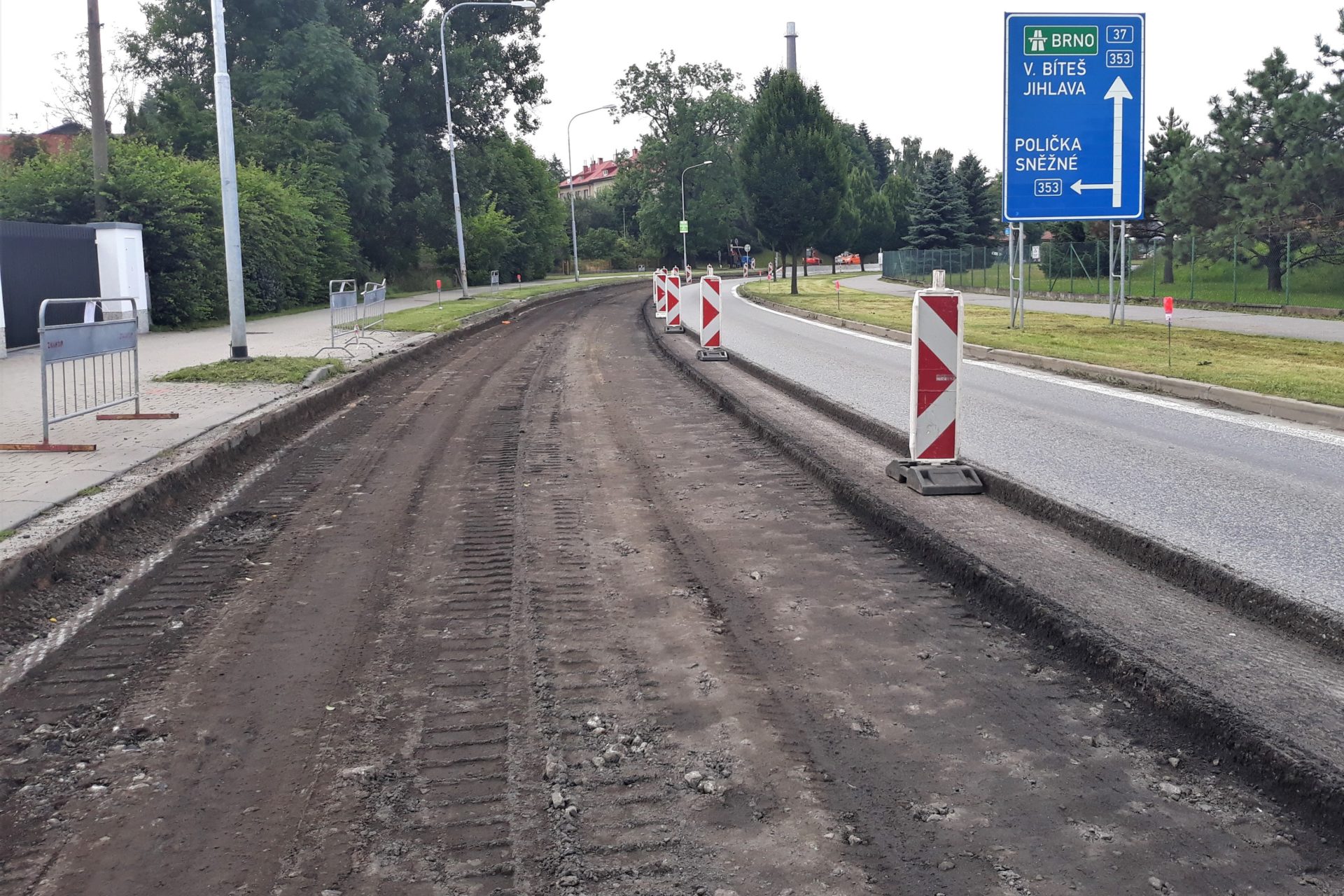 V rámci opravy silnice I/37 ve Žďáru nad Sázavou jsme aktuálně ve 2 úseku, ve kterém v průběhu 3. a 4. etapy opravíme přibližně 300 metrů v ulici Jungmannově od ulice Šípková směrem k ulici Bezručova. V jízdním pruhu ve směru z centra města jsme vyfrézovali a následně odtěžili konstrukční vrstvy až na nestmelenu podkladní vrstvu, která je ve směru ke středu vozovky tvořena štětem. U obrubníků, kde je vedeno vodovodní potrubí, je nahrazena vrstvou štěrku. Tato nesourodost pokladní vrstvy je také důvodem vzniku poruch ve vozovce a celý úsek v jízdním pruhu směrem na Ždírec nad Doubravou tak bude v rámci této 3.etapy odpovídajícím způsobe sanován.