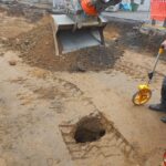 Práce na rekonstrukci silnice, které jsme zahájili počátkem září, se nyní soustřeďují v zastavěném území Krucemburku. Právě zde, v blízkosti náměstí, došlo po odkrytí konstrukčních vrstev vozovky k náhlému propadu. Vznikl kráter o průměru cca 40 cm, který dal nahlédnout do útrob fragmentů historické dešťové kanalizace. Ta se nalézá přibližně 90 cm pod povrchem. Během propadu došlo k částečnému poškození původní kamenné klenby kanalizace. Ta nyní bude vyspravena, a navíc překryta betonovou deskou. Důvodem propadu se zdá být především fakt, že před lety, kdy se v Krucemburku pokládalo vedení kabelové televize byla již během provádění těchto prací klenba kanalizace částečně narušena.