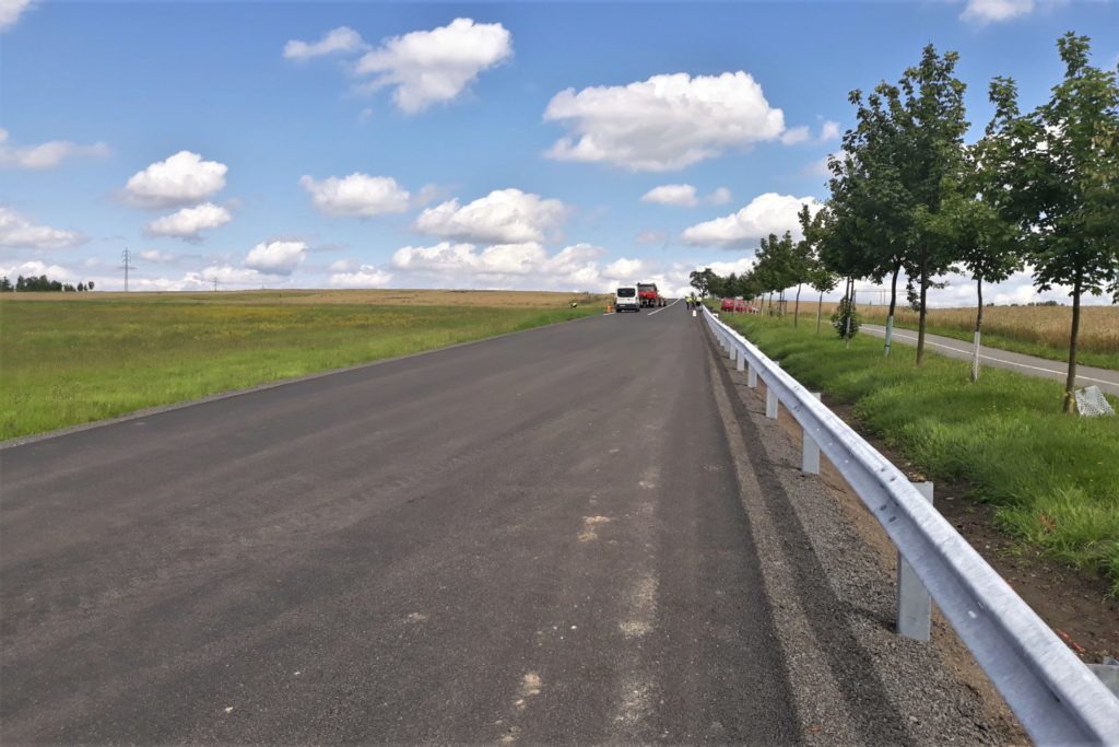 Přes uplynulý víkend jsme dokončili dosypávání krajnice a dosypávání a tvarování příkopu. Začátkem tohoto týdne jsme dokončili v celém úseku kompletně svodidla a dokončuje se instalace šikmých prefabrikovaných čel na propustcích pod přejezdy na přilehlé pozemky. Ještě zbývá dokončit vodorovné dopravní značení, to bude zatím v barvě, a po zabroušení povrchu ho obnovíme v plastu.
