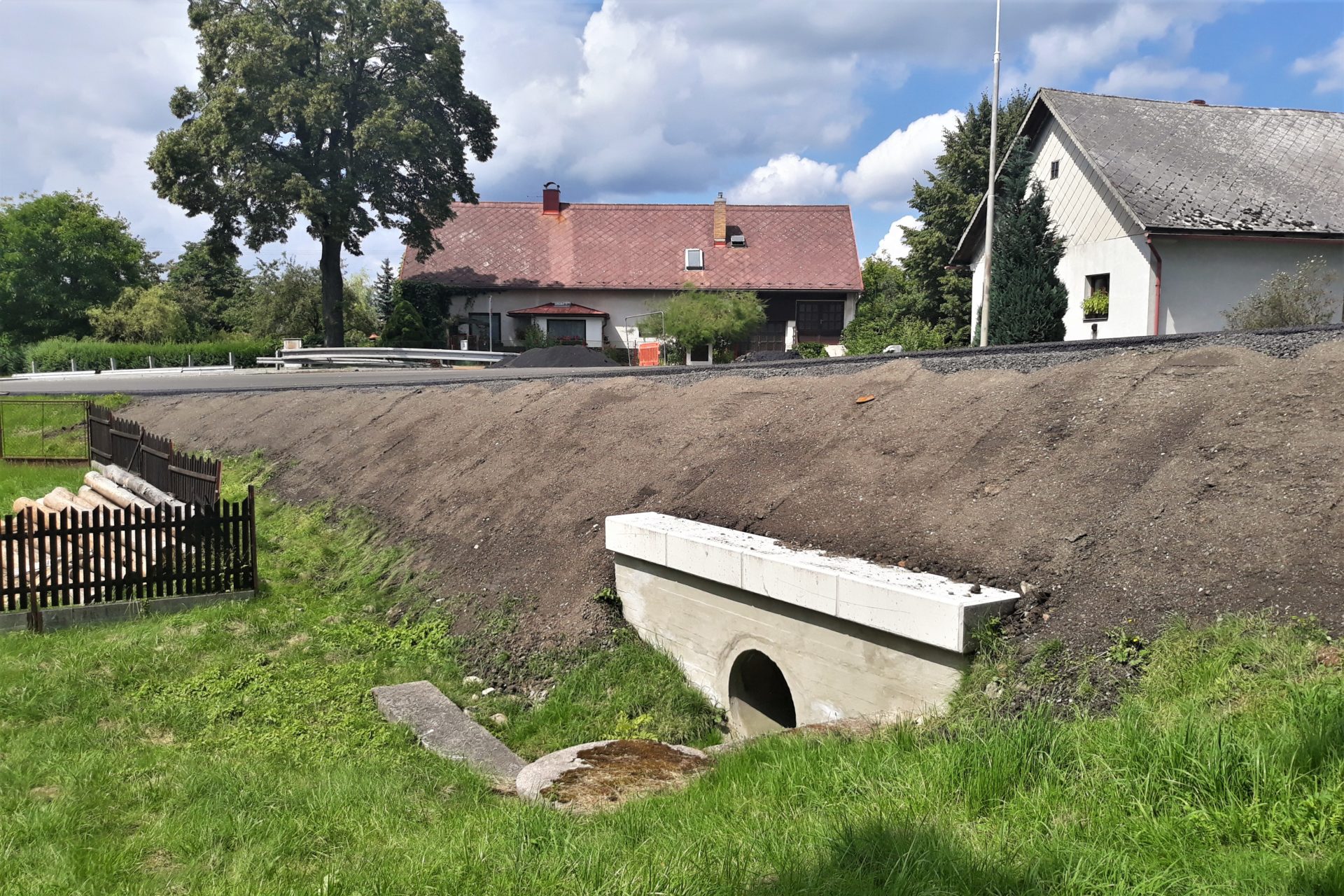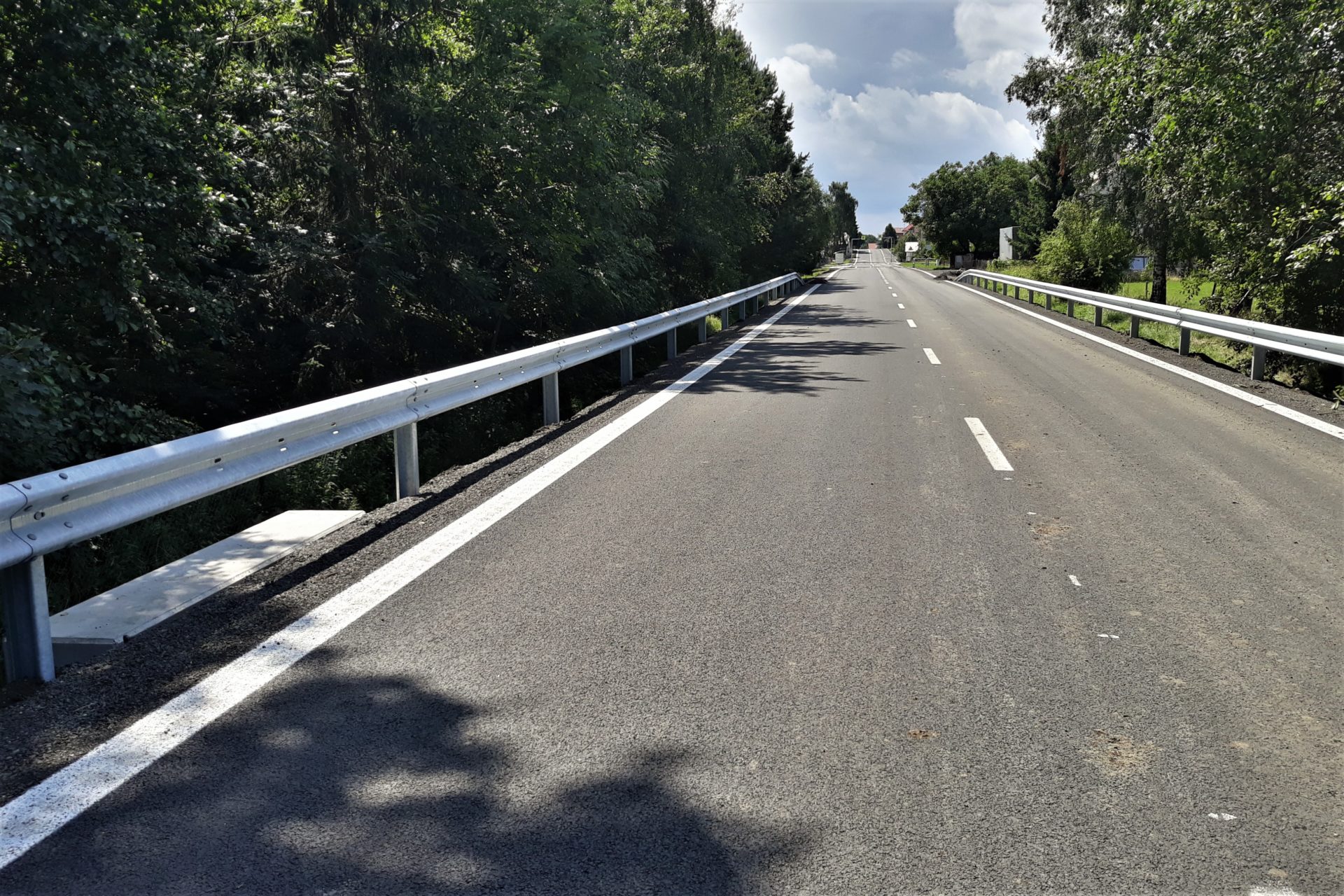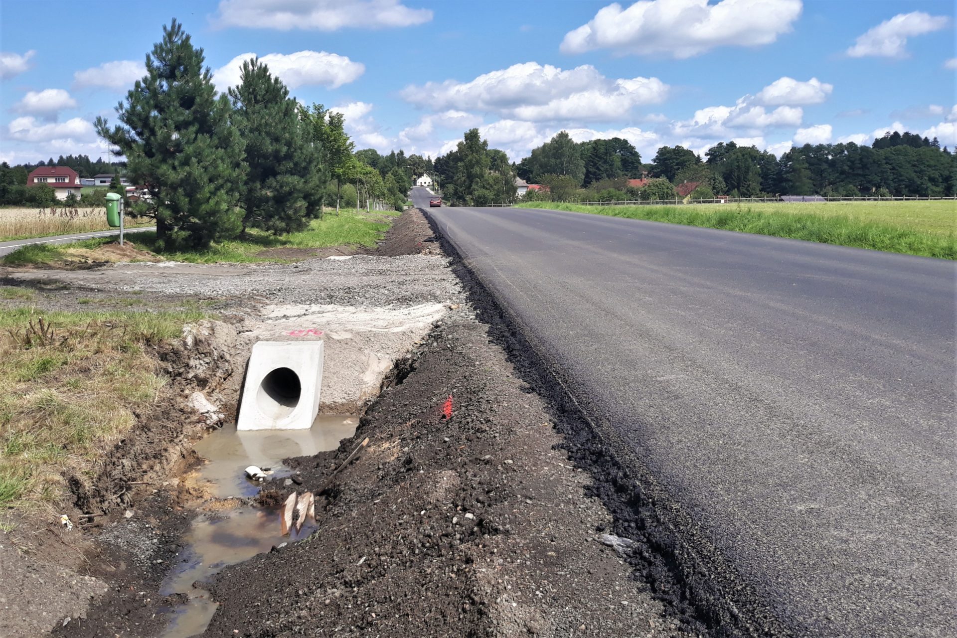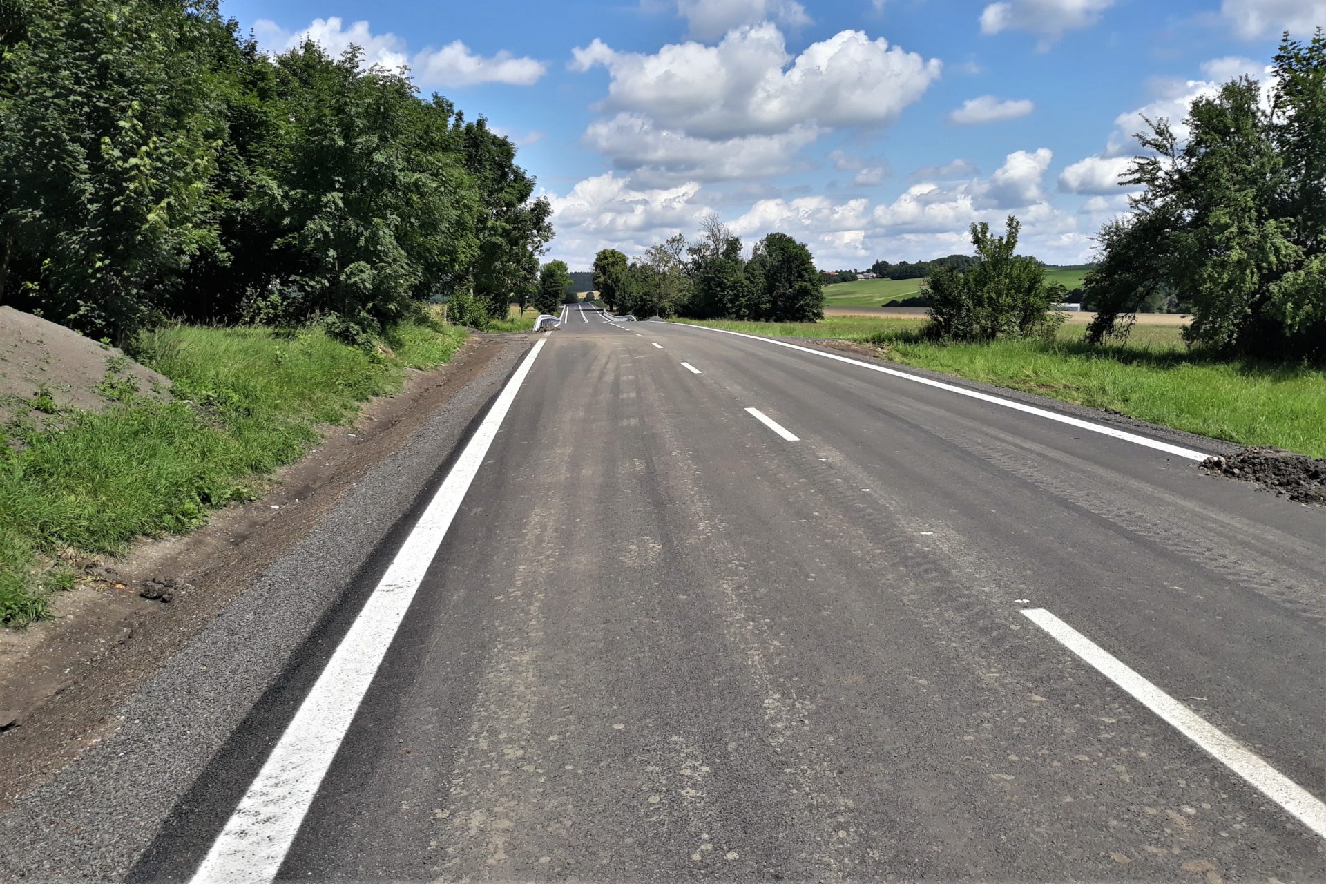 Přes uplynulý víkend jsme dokončili dosypávání krajnice a dosypávání a tvarování příkopu. Začátkem tohoto týdne jsme dokončili v celém úseku kompletně svodidla a dokončuje se instalace šikmých prefabrikovaných čel na propustcích pod přejezdy na přilehlé pozemky. Ještě zbývá dokončit vodorovné dopravní značení, to bude zatím v barvě, a po zabroušení povrchu ho obnovíme v plastu.