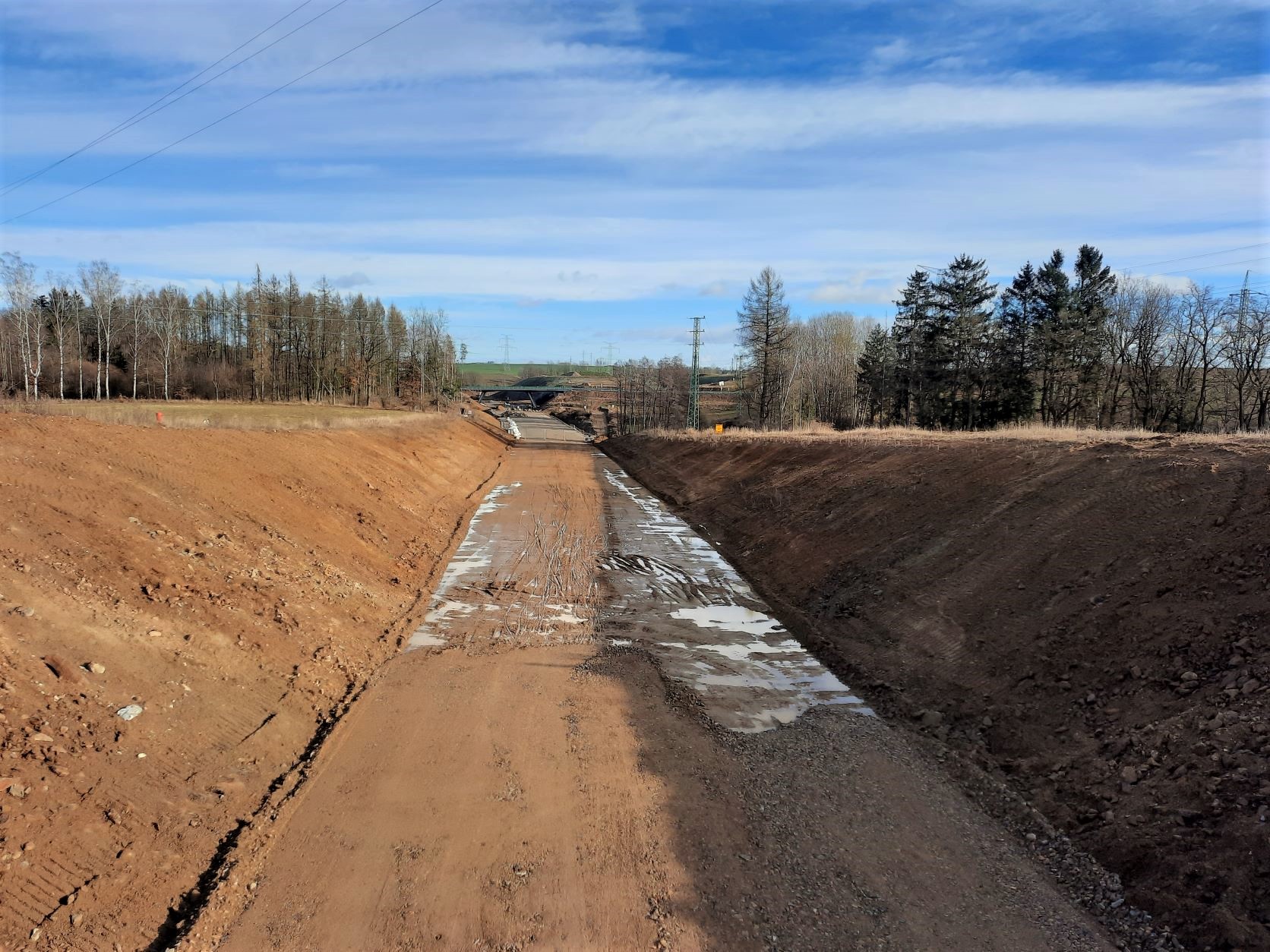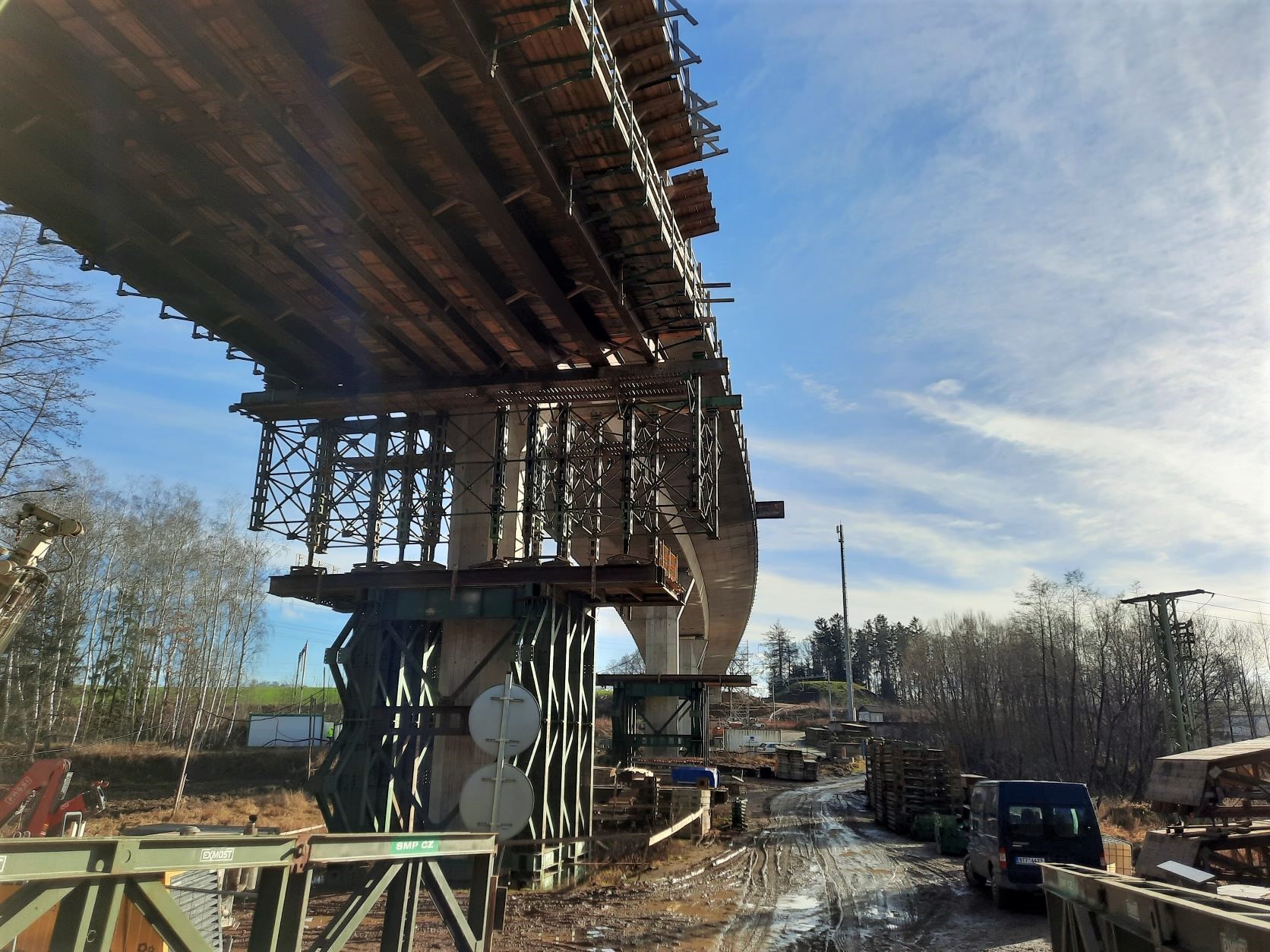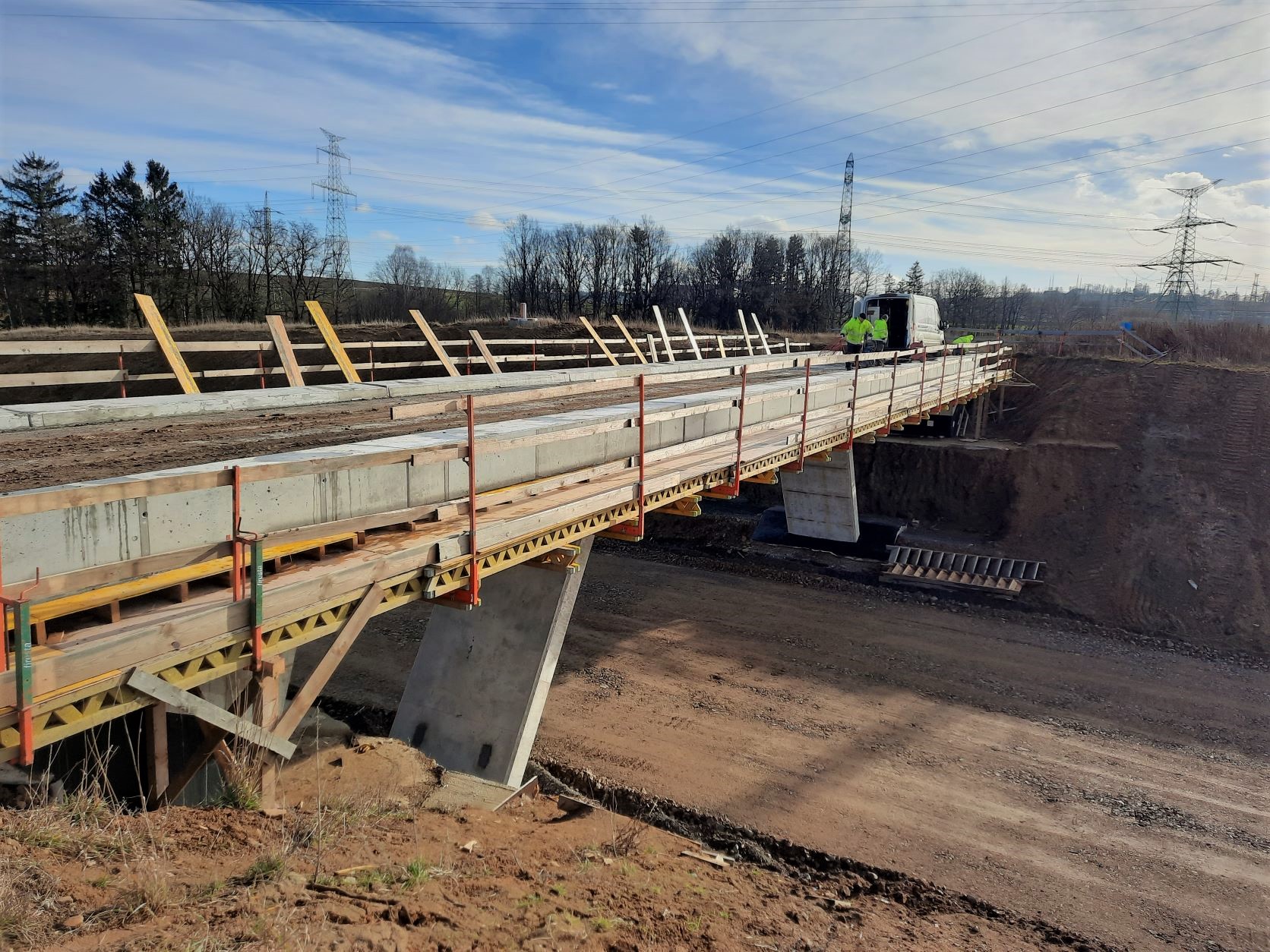 Aktuálně je dokončeno odtěžení skalního masivu u MÚK Skalka a došlo tak jejímu propojení s navazujícím mostem přes údolí říčky Šlapanka. Hned v prvním lednovém týdnu jsme dokončilo betonáž předposledního pole tohoto mostu. Nyní čekáme na výsledky zkoušek betonu a pokud výsledky budou v normě, provedeme v příštím týdnu předpětí pole nosné konstrukce. Následně budeme odbedňovat a demontovat skruž po betonáži, abychom ji začali budovat v posledním poli mostu mezi pilířem a opěrou. Pracuje se i na dalších mostech.