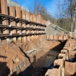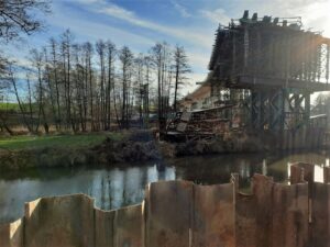 Z nich bych zmínil zejména most přes údolí Sázavy, který současně překlenuje i 2 železniční trati. Tady je před námi ještě betonáž 2 polí mostu. Aby ji však bylo možné provést, je třeba vybudovat poslední mostní pilíř, který se nachází v poměrně nedostupné části na břehu řeky Sázavy, mezi ní a železniční tratí H. Brod-Jihlava. V tomto místě probíhá aplikace stříkaného betonu v rámci dokončení zajištění náspu trati. Jakmile toto zajištění dokončíme, přistoupíme již k vrtání pilot pro založení zbývajícího pilíře.