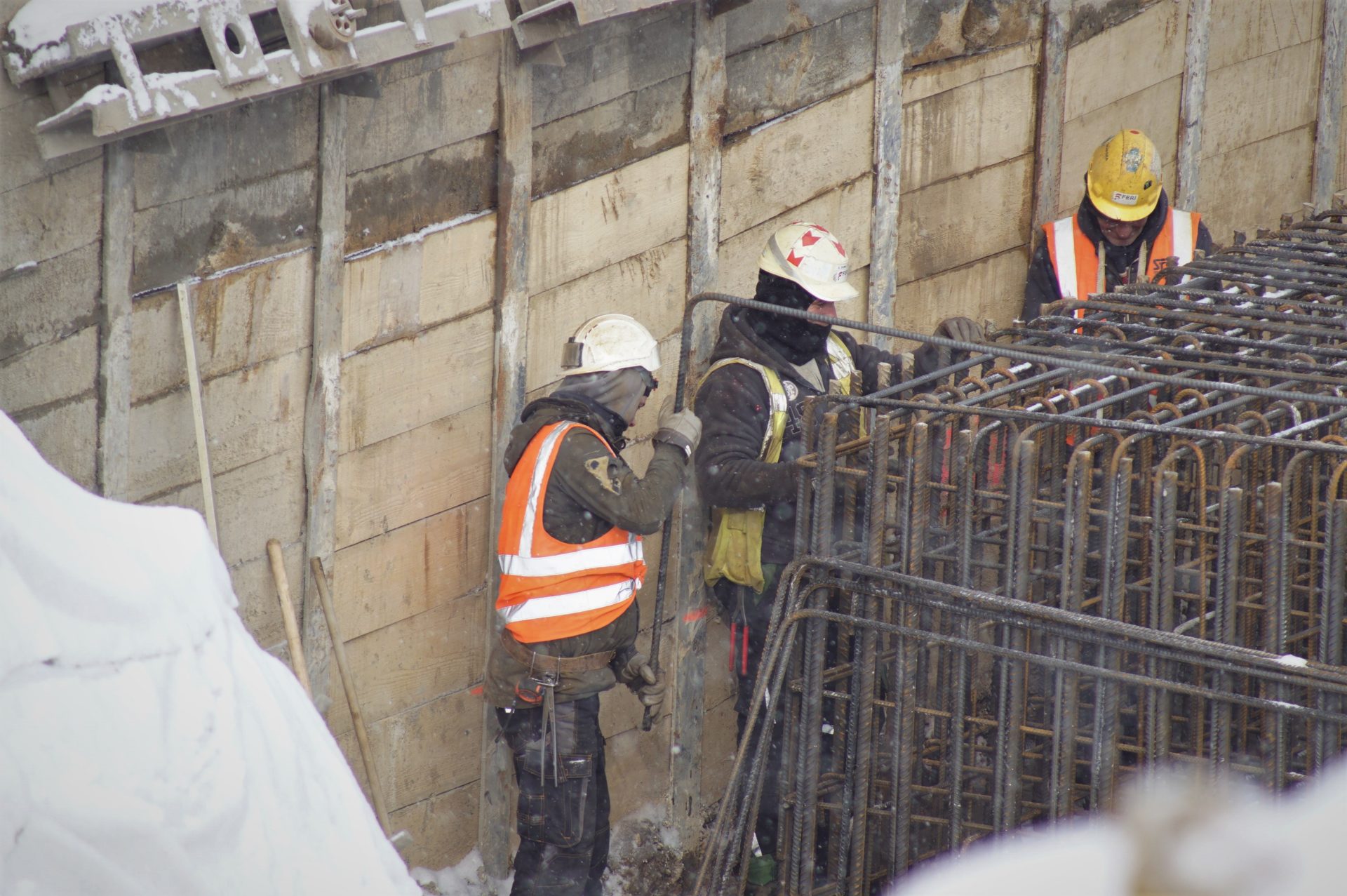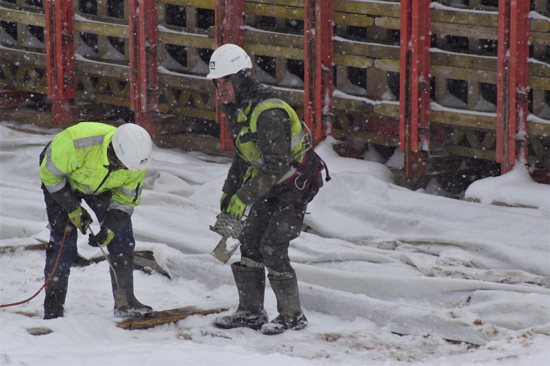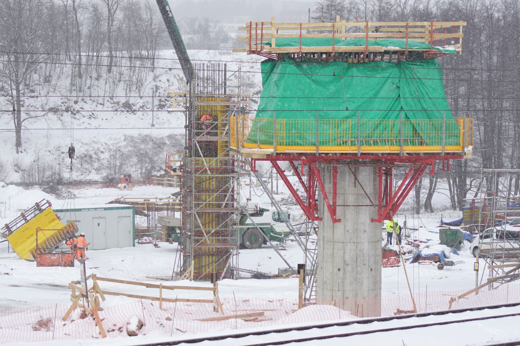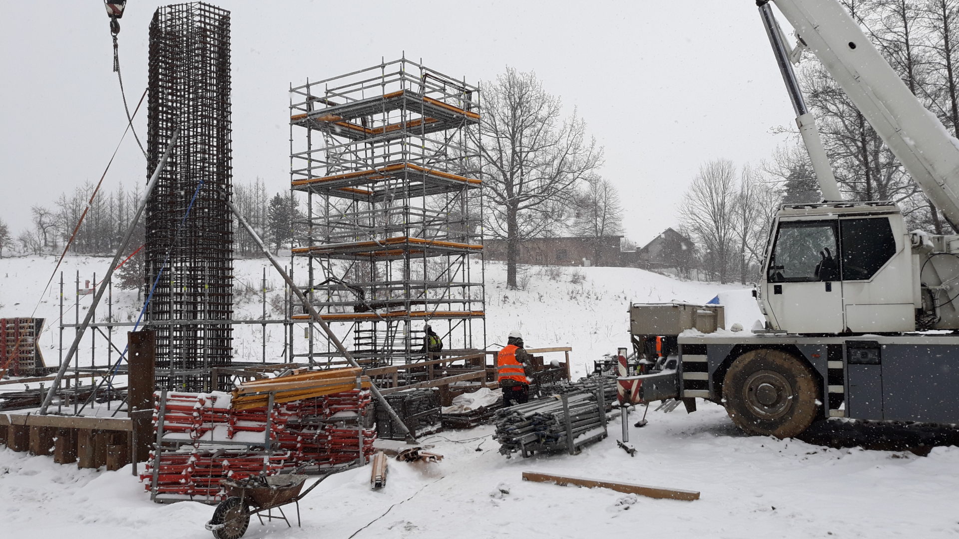 V průběhu této zimy se pracuje rovněž na 3 mostních objektech (např. v údolí Sázavy, Stříbrného potoka), kde se realizují technologie, které lze provádět s ohledem na aktuální meteorologické podmínky. Probíhají práce na výstavbě mostních pilířů a opěr a přípravné zemní práce právě v místech výstavby dalších mostů v hlavní trase obchvatu. I v teplotách hluboce pod bodem mrazu kompletujeme ocelové betonářské výztuže (armování) a stavíme bednění před betonáží, která bude následovat, jakmile to podmínky dovolí.