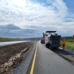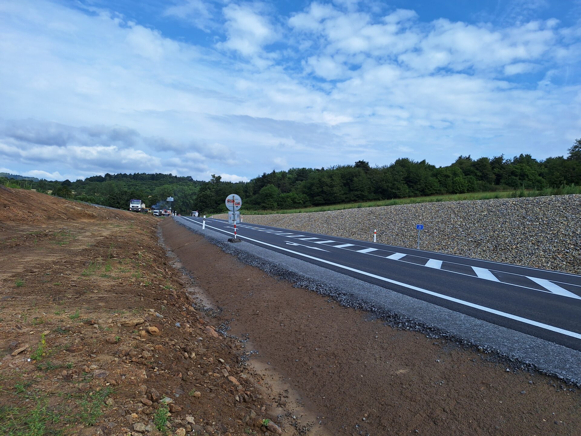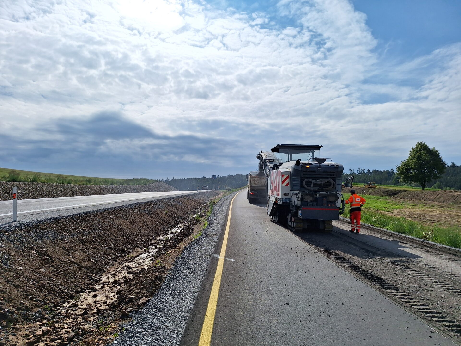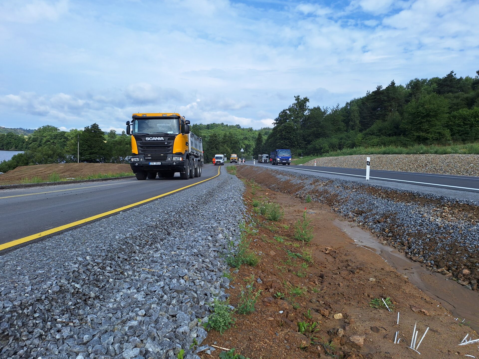 Silnice I/23 vede v prostoru upravované křižovatky nově v zářezu hlubokém až 4,5 m. Svahy, které ji lemují, jsme zpevnili kamenivem a vybudovali plnohodnotný systém odvodnění. Na vozovku hlavní trasy jsme upotřebili 2 000 tun asfaltové směsi, což představuje náklad pro přibližně 130 nákladních vozidel. Práce se nyní přesouvají na úpravu vedlejší komunikace, která bude nově rovněž situována v zářezu. Kvůli skalnatému podloží jsme nasadili výkonnou těžkou techniku. Vedle toho začínáme likvidovat původní silnici a navazující provizorní komunikaci, po které byla dosud vedena doprava. Asfaltové souvrství odfrézujeme a terén upravíme. Denně se na stavbě podílí na 20 dělníků.