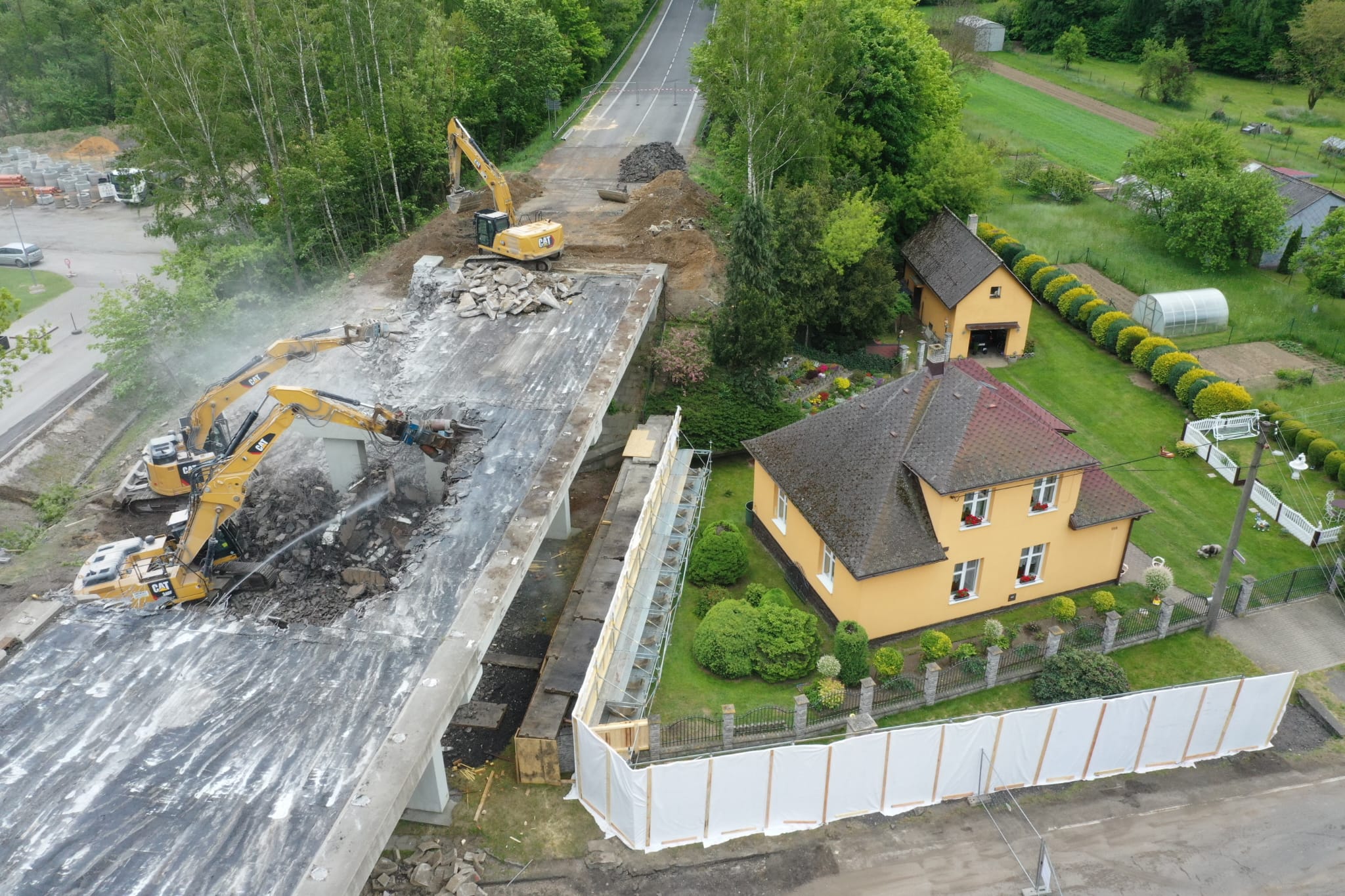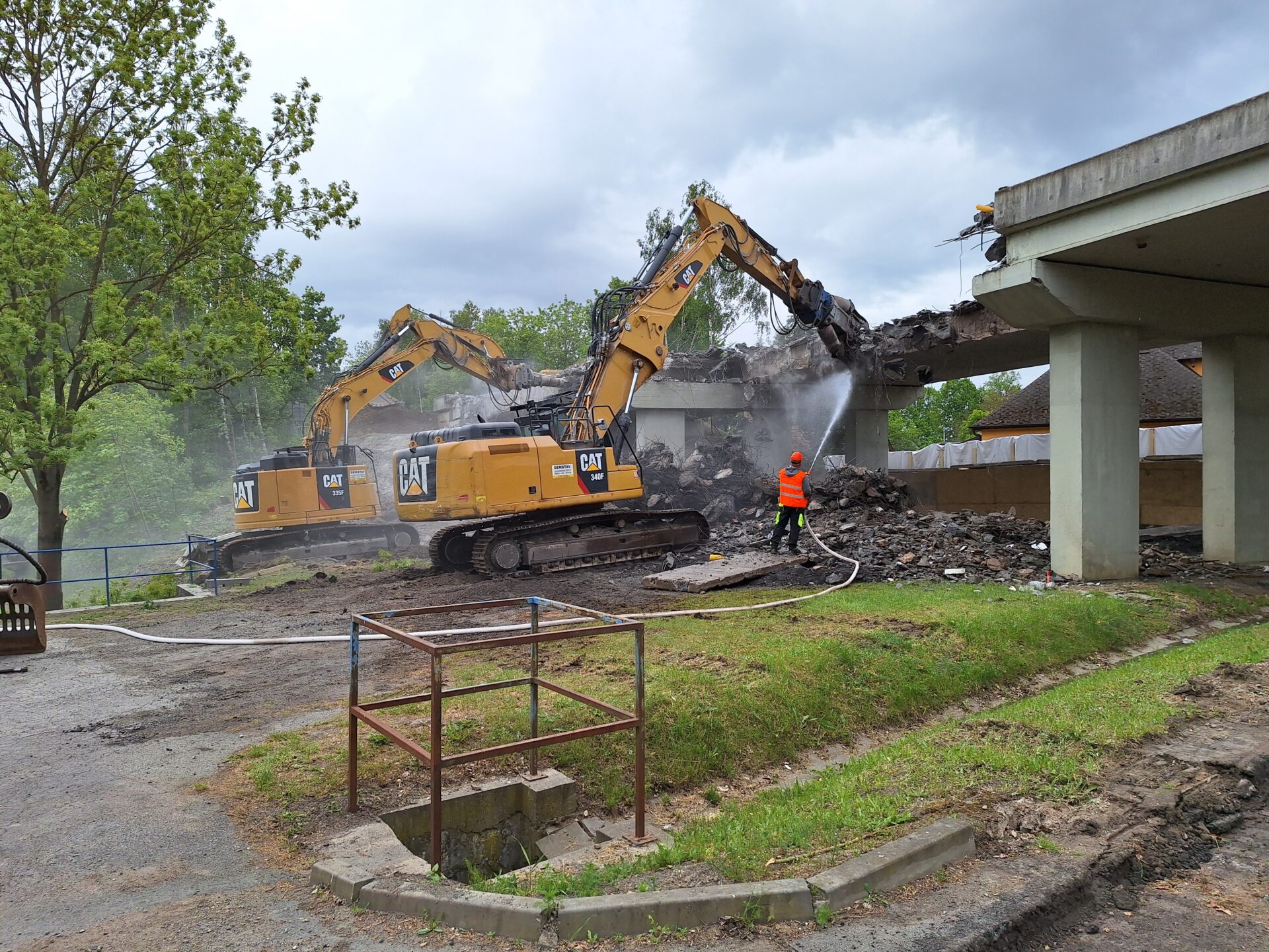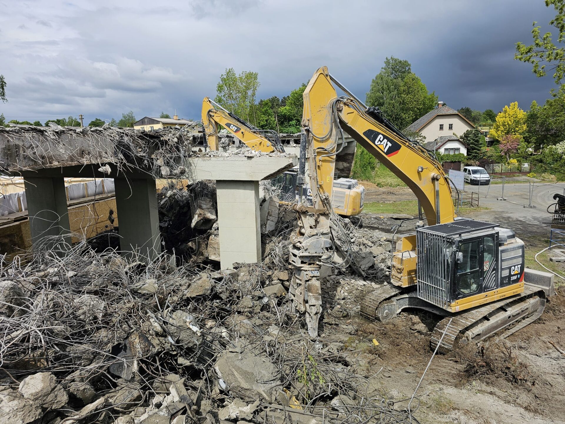 Za pomocí těžké techniky, především bagrů vybavených hydraulickými nůžkami, se nám podařilo dokončit podle plánu demolici původního mostu. Svezeno na mezideponii bylo kolem 2 000 tun suti. Ta teď bude vytříděna a částečně recyklována tak, že nadrcený materiál bude znovu zapracován do stavby.