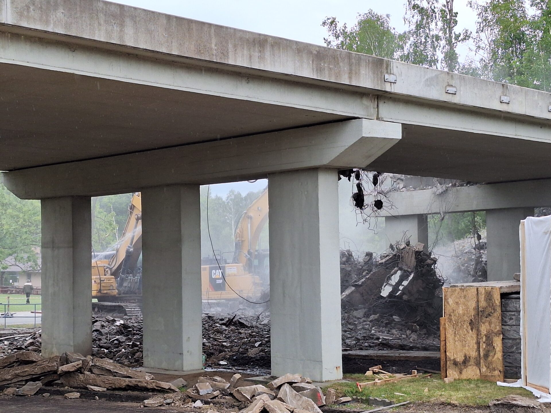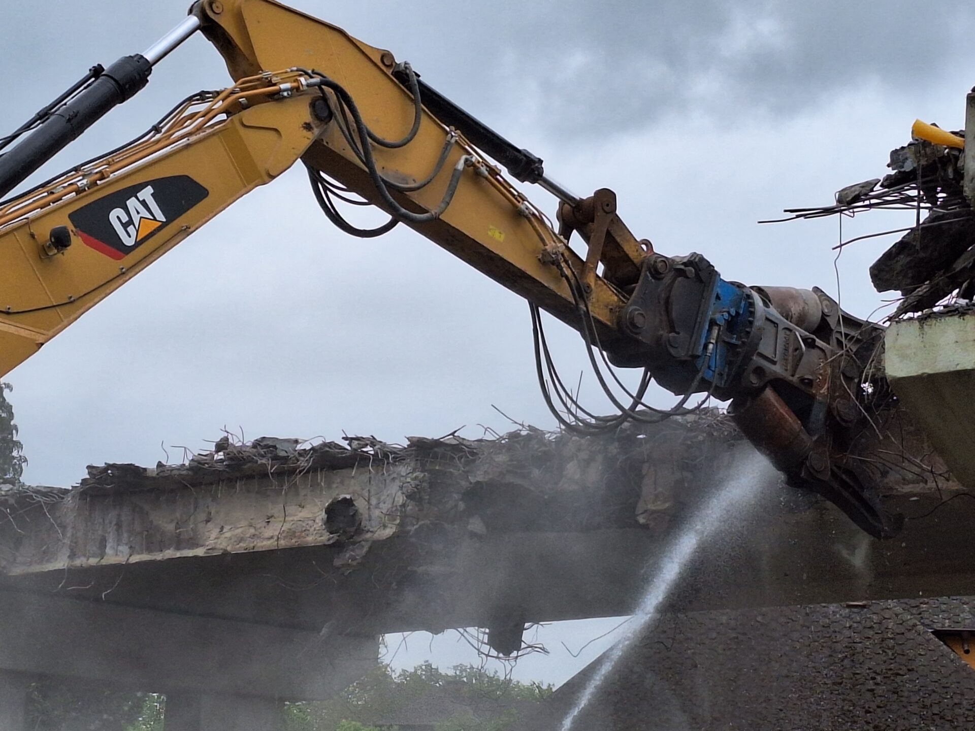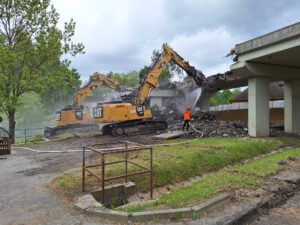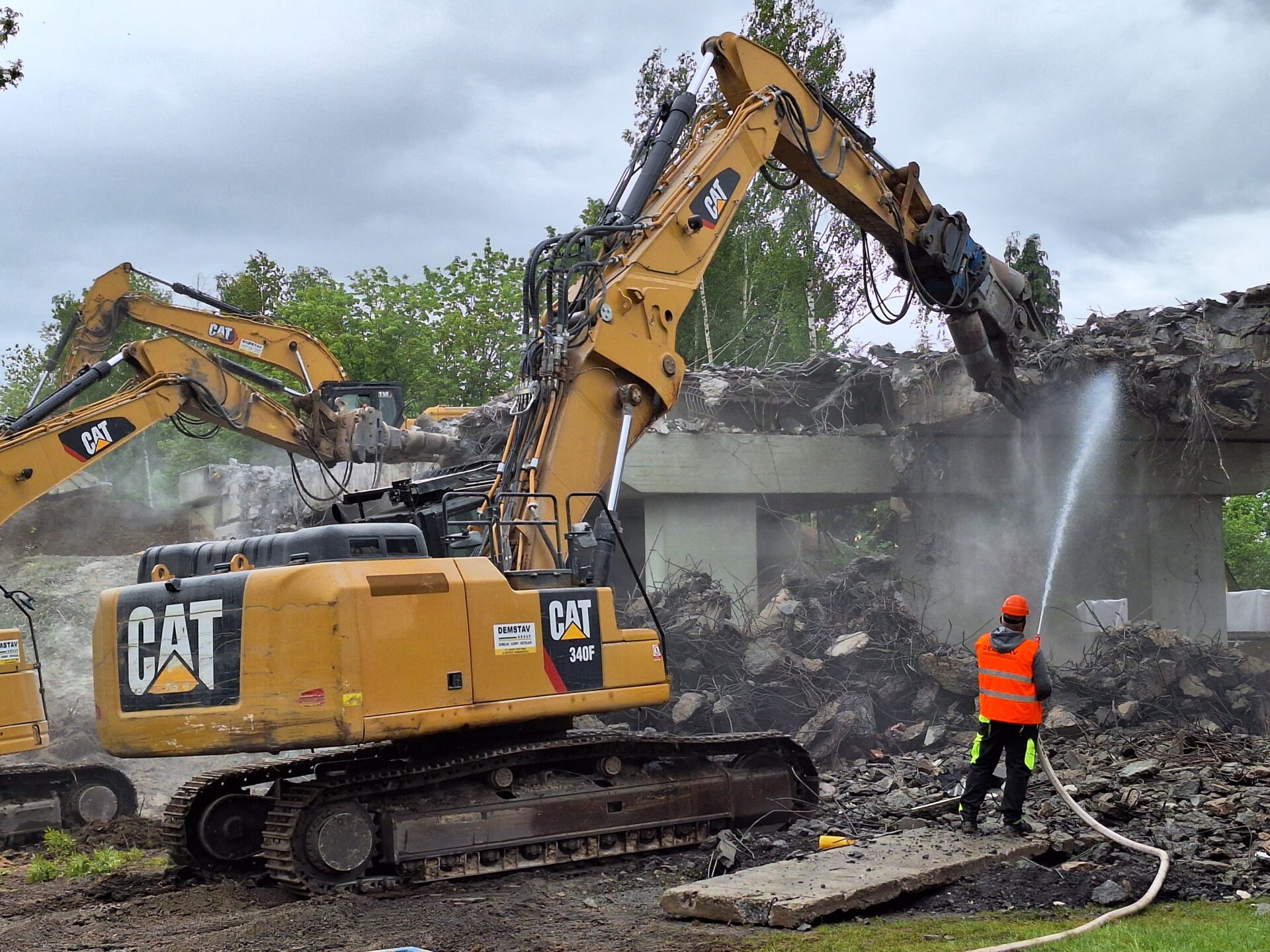 Za pomocí těžké techniky, především bagrů vybavených hydraulickými nůžkami, se nám podařilo dokončit podle plánu demolici původního mostu. Svezeno na mezideponii bylo kolem 2 000 tun suti. Ta teď bude vytříděna a částečně recyklována tak, že nadrcený materiál bude znovu zapracován do stavby.