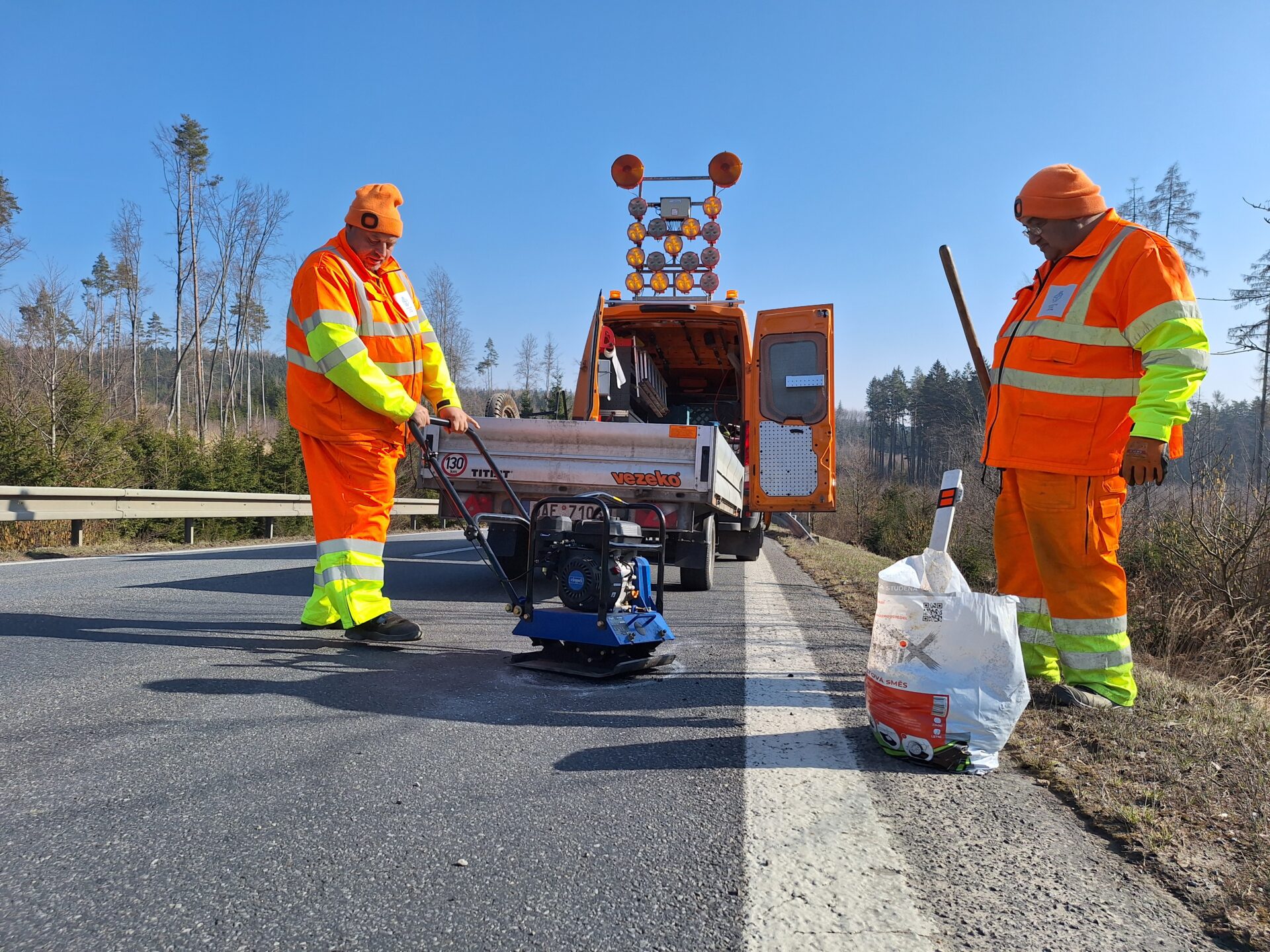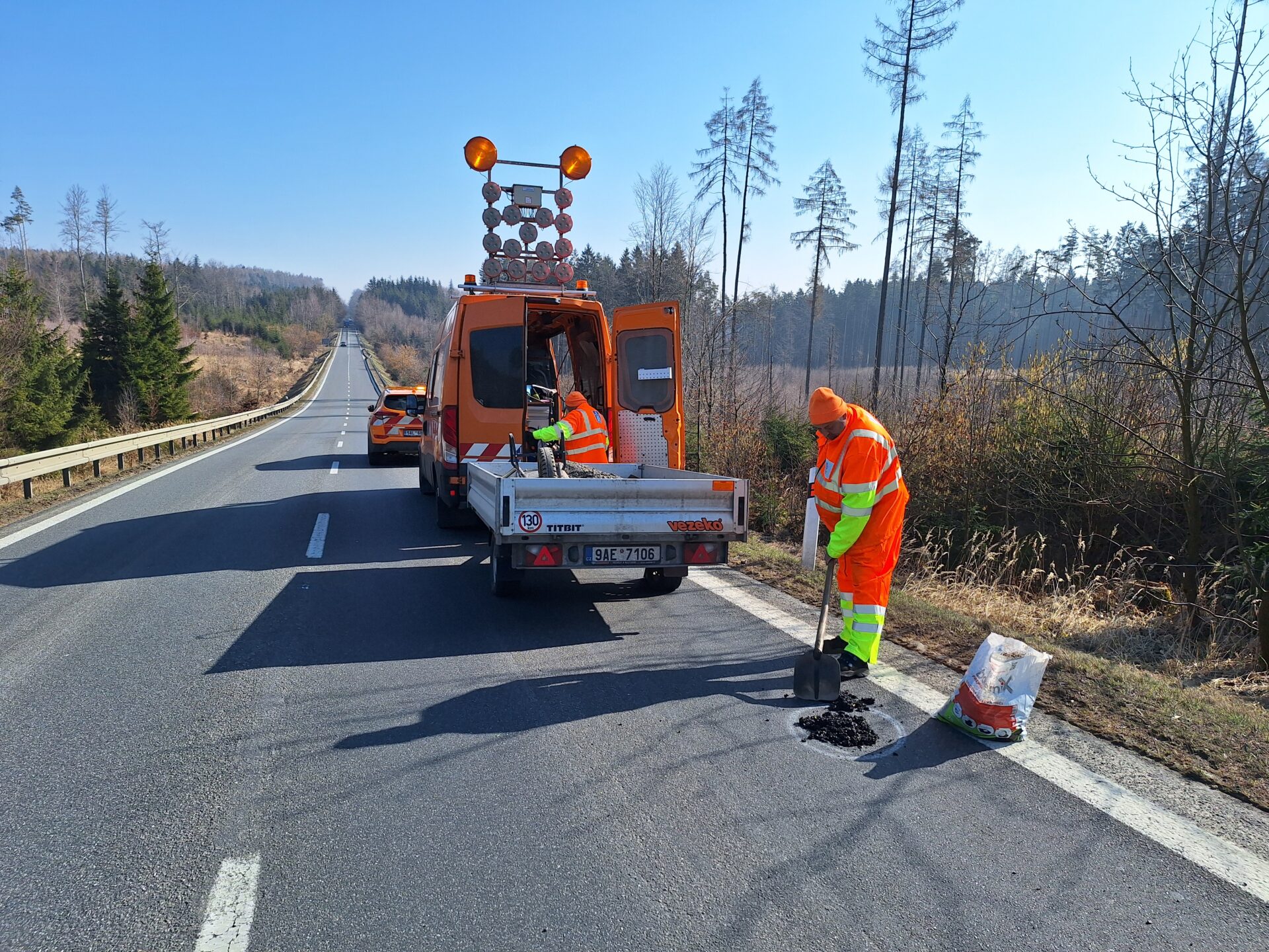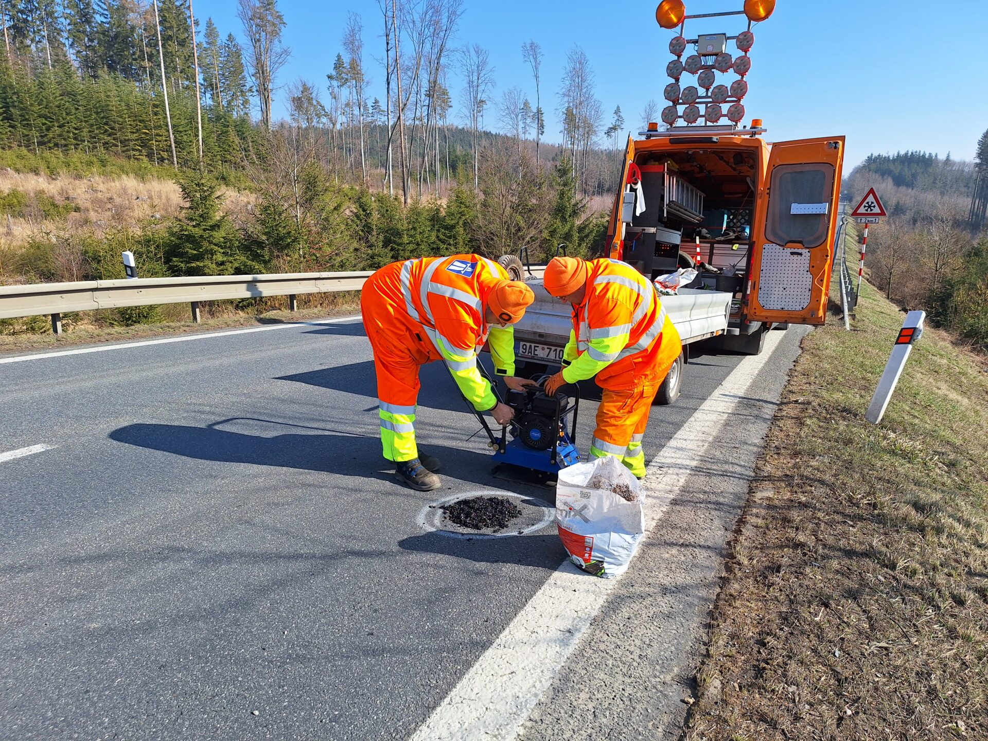 Opravě výtluků je kvůli jejich četnosti nyní věnována mimořádná pozornost. Rychlá rota je vyspravuje studenou balenou asfaltovou směsí. K opravám si vozí také potřebné náčiní a strojní vybavení. Plně naložená pohotovostní dodávka má celkovou hmotnost bezmála 3,5 tuny, v důsledku toho jsou rozjezdy s ní pomalejší a brzdná dráha delší. Upozorňujeme na tuto skutečnost ostatní účastníky silničního provozu a zároveň žádáme o ohleduplnost k našim zaměstnancům v místě prací.