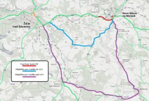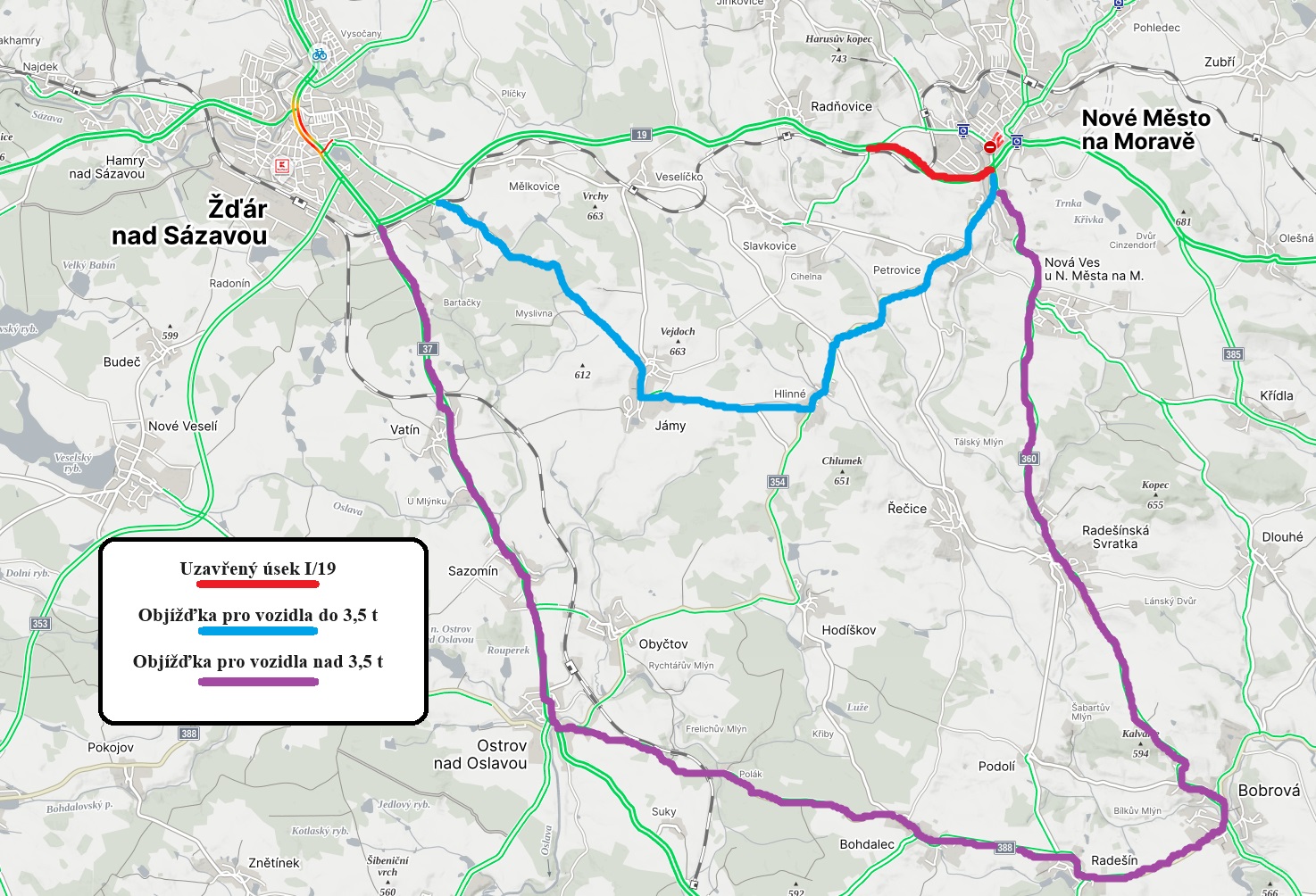 - Zcela uzavřen pak bude úsek silnice I/19 v délce 1900 m, a to od křižovatky s místní komunikací III/35418 (směr Slavkovice) po okružní křižovatku v Novém Městě na Moravě. Denně tudy projede více než 9 tisíc vozidel, z toho přibližně 13% tvoří nákladní auta a kamiony.