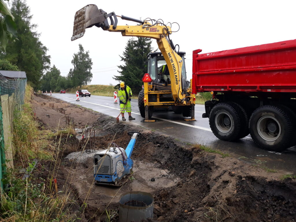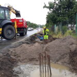 V těchto dnech se práce soustřeďují na budování základů protihlukové stěny. Betonují se vyvázané armatury a rovněž dochází k úpravě příkopů a okolního terénu.