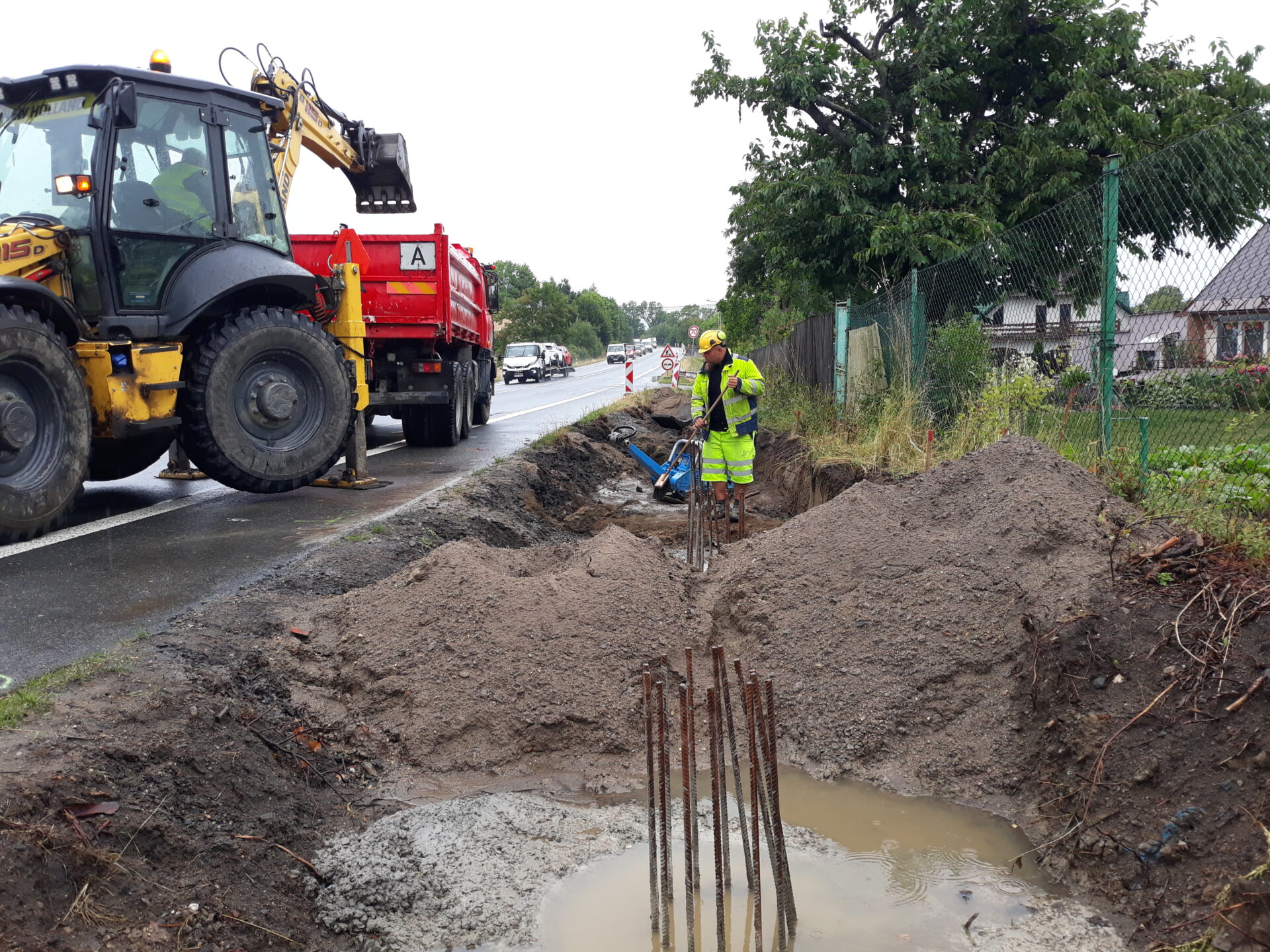 V těchto dnech se práce soustřeďují na budování základů protihlukové stěny. Betonují se vyvázané armatury a rovněž dochází k úpravě příkopů a okolního terénu.