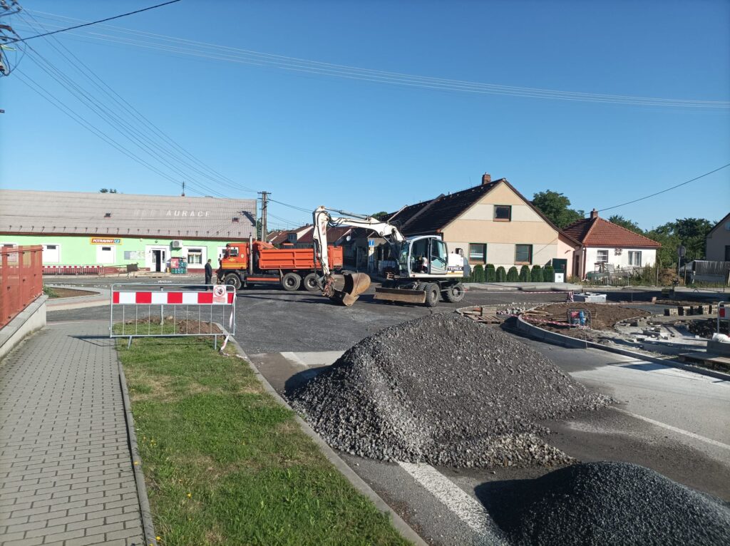 Křižovatkou projede podle posledního sčítání dopravy každý den téměř 2000 vozidel. V tuto chvíli je původní vozovka odfrézovaná a dochází k pokládce mechanicky zpevněného kameniva. I když jsme před dvěma lety uvedli do provozu vybudovaný obchvat, stále zůstává původní trasa I/37 vedoucí centrem obce v naší správě.