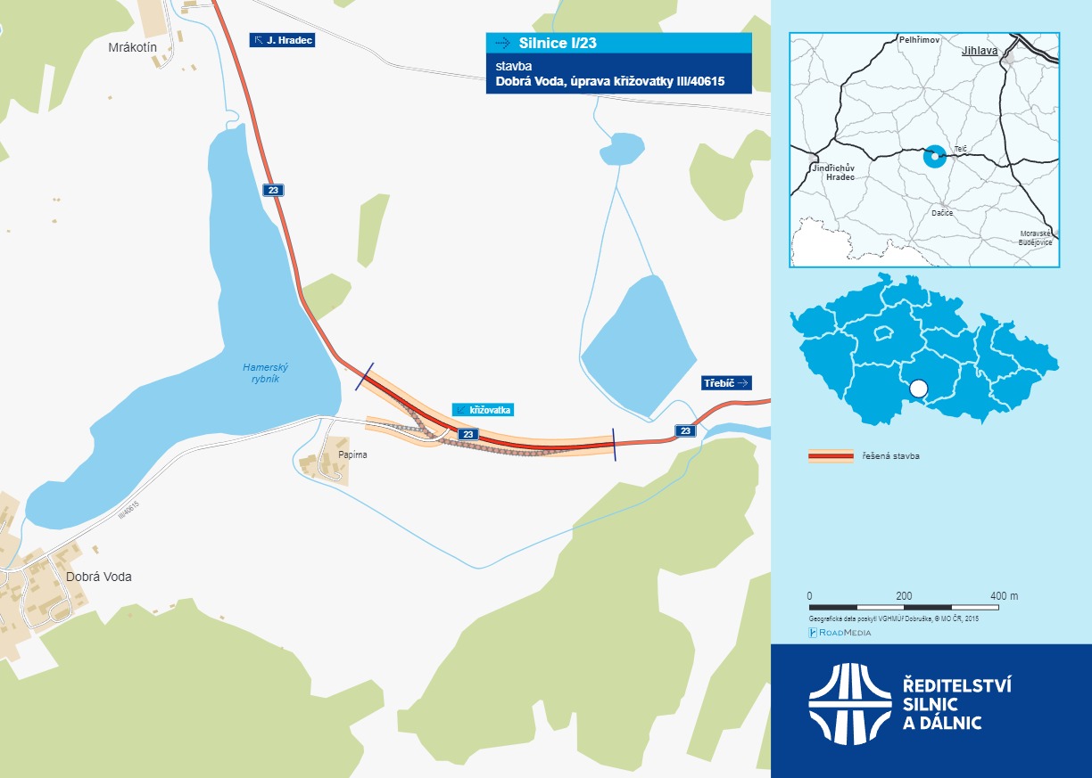 Našim cílem je odstranění bodové závady, kterou je z pohledu bezpečnosti silničního provozu nebezpečná styková křižovatka silnic I/23 a III/40615, poblíž Dobré Vody, v katastrálním území Mrákotín u Telče. Jedná se o značně nepřehlednou křižovatku, a to vzhledem k nenormovému směrovému a výškovému vedení silnice I/23. Zároveň je silnice III/40615 na hlavní komunikaci připojena ve vrcholovém lomu nivelety umístěném ve směrovém oblouku. O nebezpečnosti stávajícího křížení obou silnic svědčí statistiky dopravních nehod z posledních let, přitom každý den projde tímto místem na 4 tisíce vozidel, z toho cca jednu čtvrtinu tvoří nákladní a kamionová doprava.