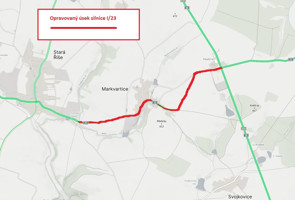 Práce budou rozděleny na dvě etapy. Nejprve přijde na řadu úsek Stará Říše – Markvartice a pak Markvartice – Kasárna. V těchto dnech se s místními samosprávami, dotčenými subjekty a Policií ČR projednávají objízdné trasy, protože opravované úseky budou po dobu oprav zcela uzavřeny. Předpokládané zahájení prací na silnici I/23 mezi městysem Stará Říše a osadou Kasárna je v druhé půlce července s tím, že hotovo by mělo být za 21 týdnů.