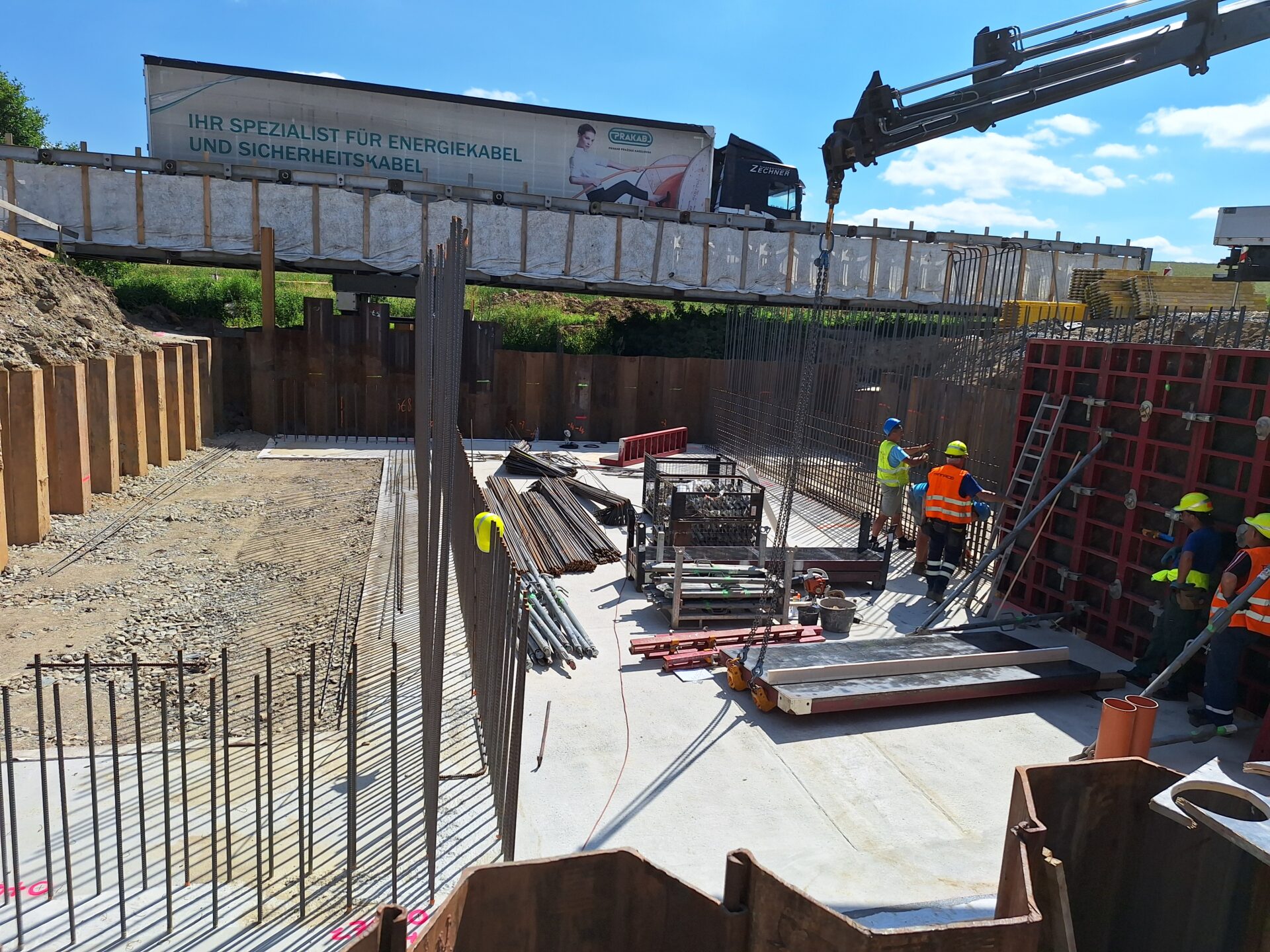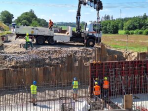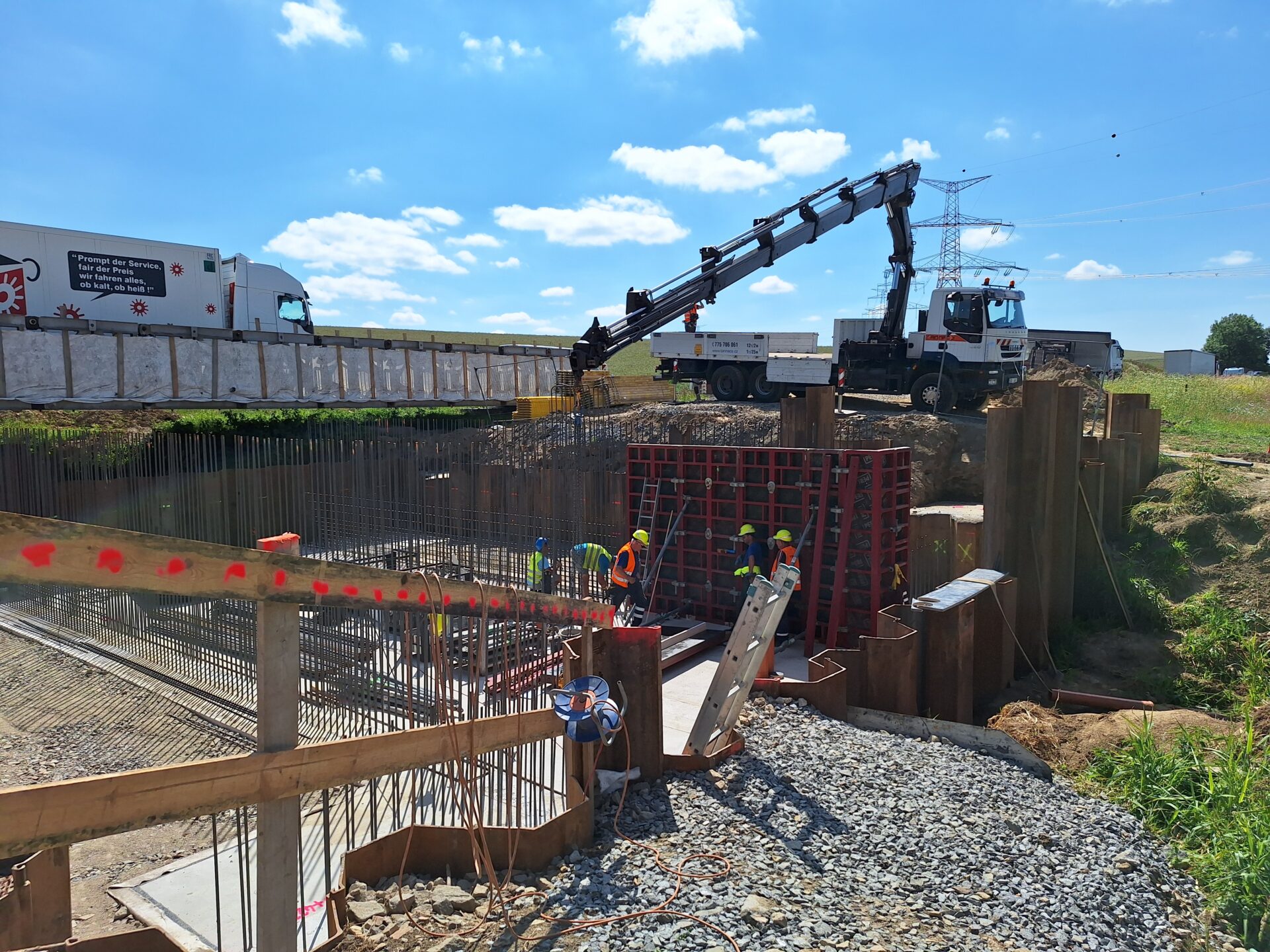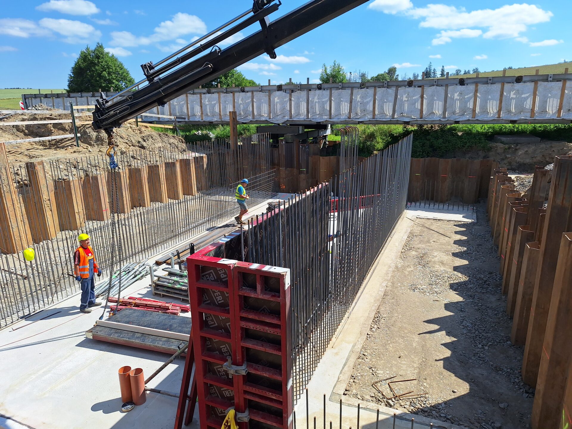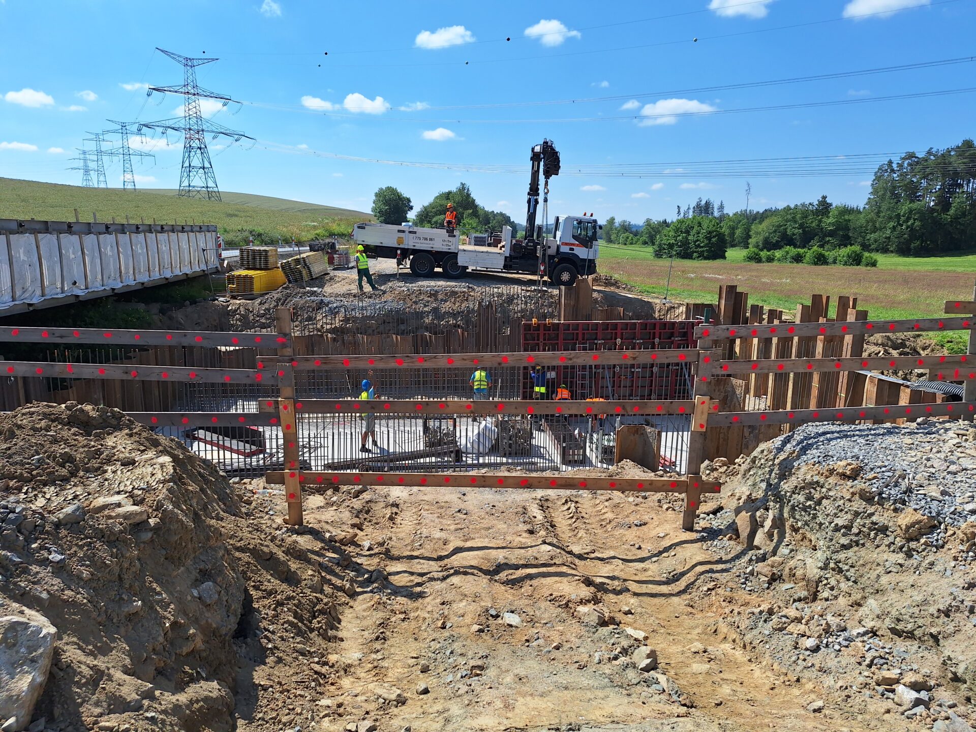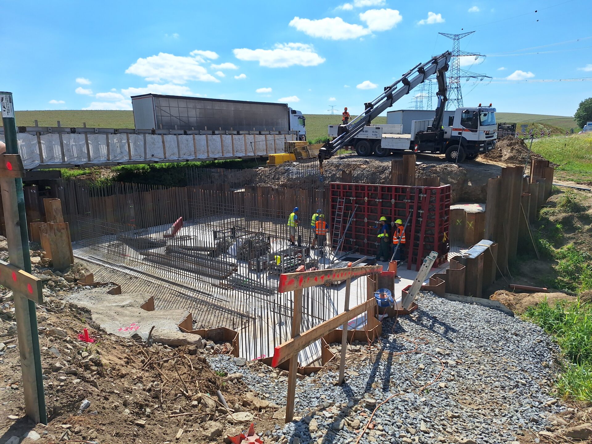 Původní most byl v uplynulých týdnech zdemolován a na jeho místě se postupně buduje nový. Hotová je již základová konstrukce, momentálně se armují a bedňují dříky opěr, které tvoří základ nového mostu. V druhé polovině července počítá harmonogram výstavby s betonáží celé mostní konstrukce najednou.