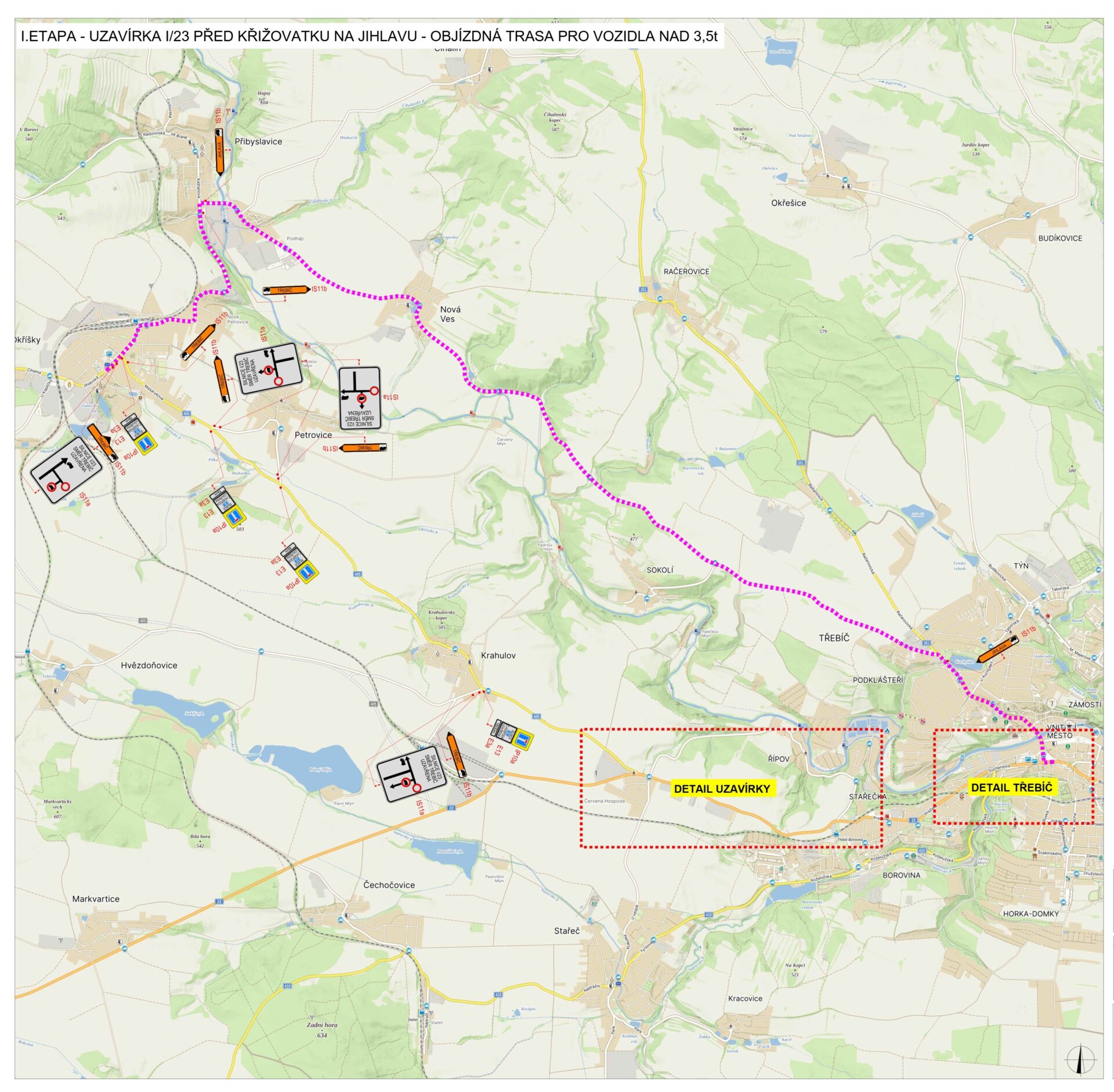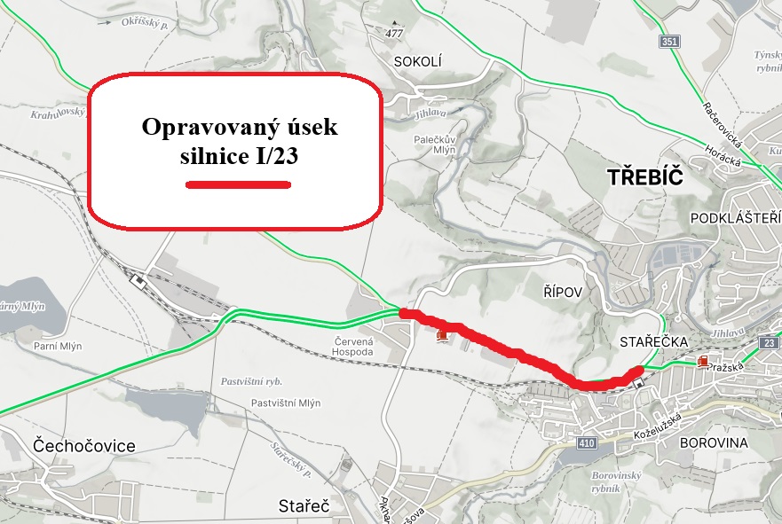 Stavební akci bude provázet úplná uzavírka. Řidičům budou k dispozici vyznačené objízdné trasy. Pro vozidla do 3,5 t po silnici II/410, pro vozidla nad 3,5 t přes Novou Ves a Okříšky. V první etapě 12.5. – 16.5. bude umožněno obousměrně projet přes křižovatku v Červené Hospodě od Starče na Telč a Okříšky. V termínu 17.-18.5. bude plně uzavřena i křižovatka z důvodu pokládky asfaltových vrstev. Od 19. – 25.5. bude křižovatka opět zprůjezdněna, mimo směr Třebíč, kde bude probíhat pokládky asfaltových vrstev.
