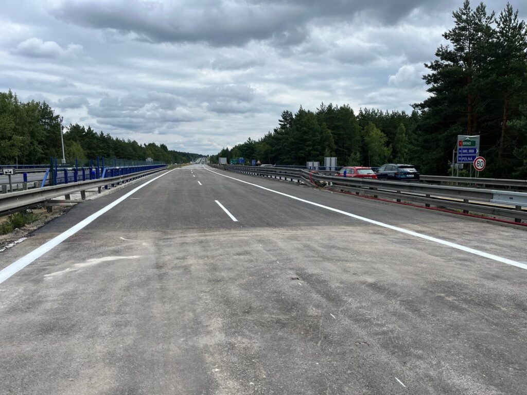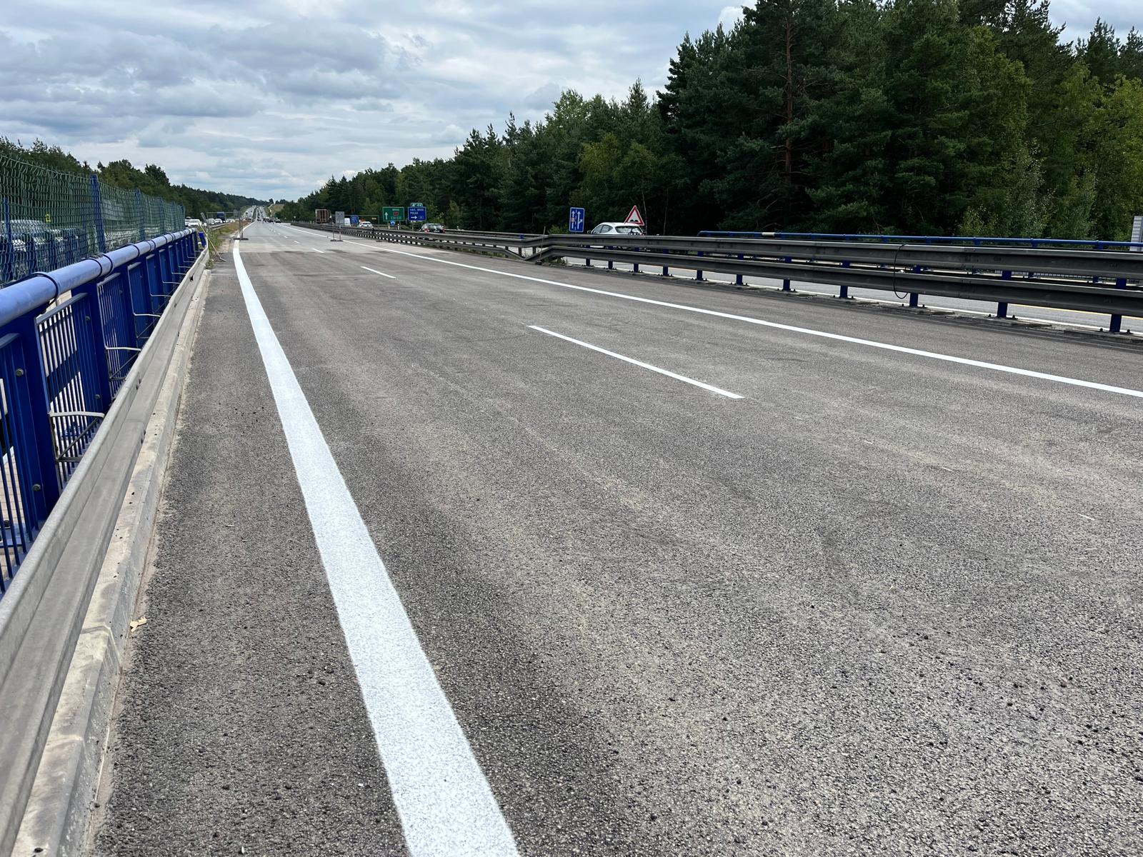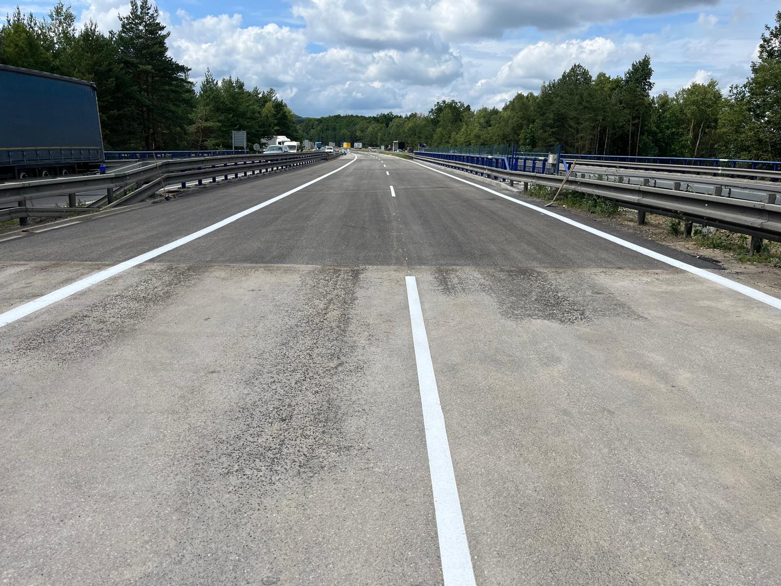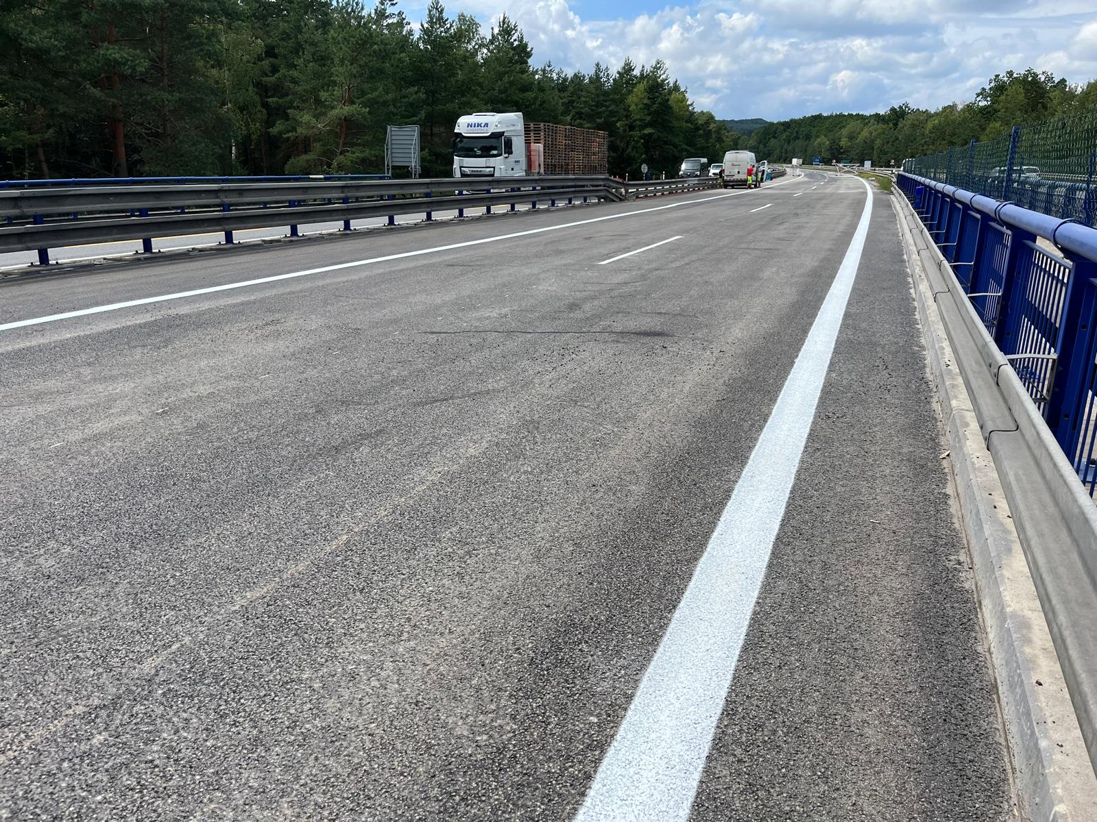 Obnovou vodorovného dopravního značení vrcholí rekonstrukce už druhé poloviny mostu ev. č. D1-147 směr Brno. Práce teď budou pokračovat nadále pod mostem, na silnici I/38, kde budeme sanovat spodní stavbu mostu a upravovat svah. Vedle toho začneme s rekonstrukcí přilehlého kolektoru směr Brno. Kromě frézování starého asfaltového souvrství a pokládce nového zde budou také vyměněny železobetonové vyrovnávací desky, podobně jako na mostě.