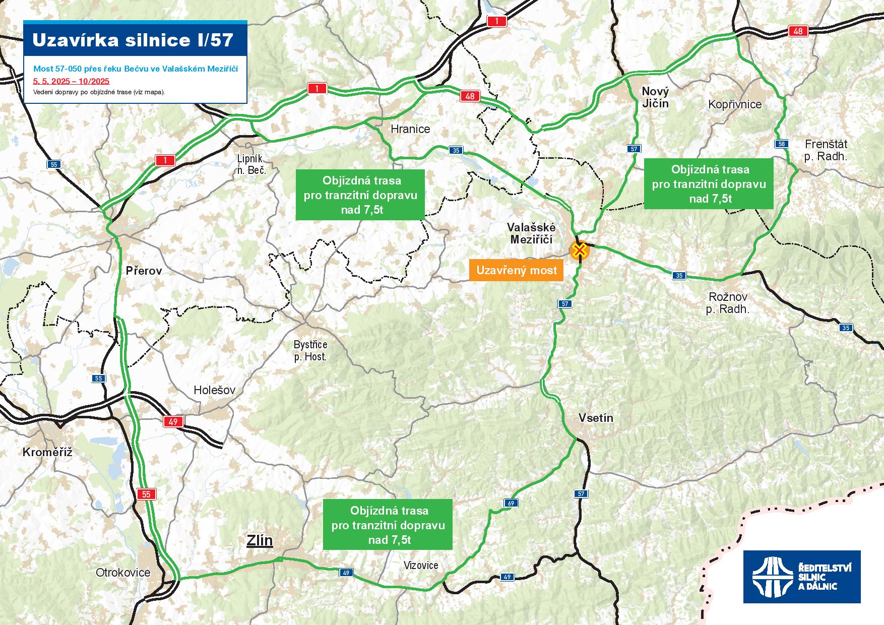 Objízdná trasa pro vozidla jedoucí ve směru na Hranice bude vedena po silnicích III/05721 a II/150. Vozidla jedoucí do Vsetína projedou po silnicích I/57, II/150 a místní komunikaci v ulici Palackého.