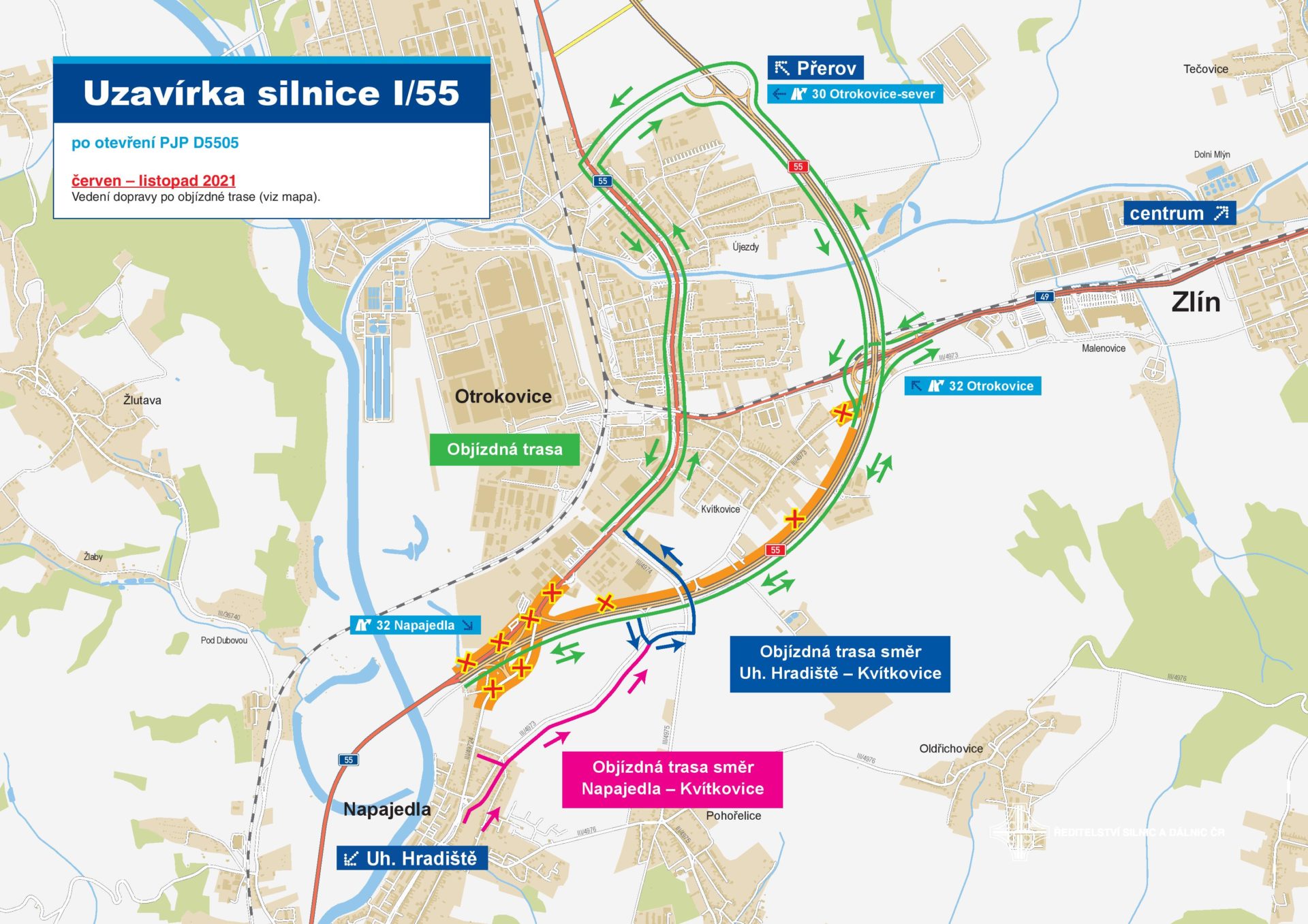 Pravý jízdní pás jihovýchodního obchvatu Otrokovic zprovozníme v úterý 29. 6. ve 14:00! Upozorňujeme však na velké riziko dopravních komplikací právě v době mezi 14:00 – 15:00! Ve stejný čas musíme současně uzavřít silnici I/55 mezi Napajedly a Kvítkovicemi, otevřít pravý jízdní pás nového úseku dálnice D55 a dále na různých místech označit objízdné trasy. Prosíme řidiče, pokud můžete, naplánujete si první jízdu na pozdější odpolední čas, kdy se na obchvatu ustálí nově zavedený provoz v režimu 1+1.