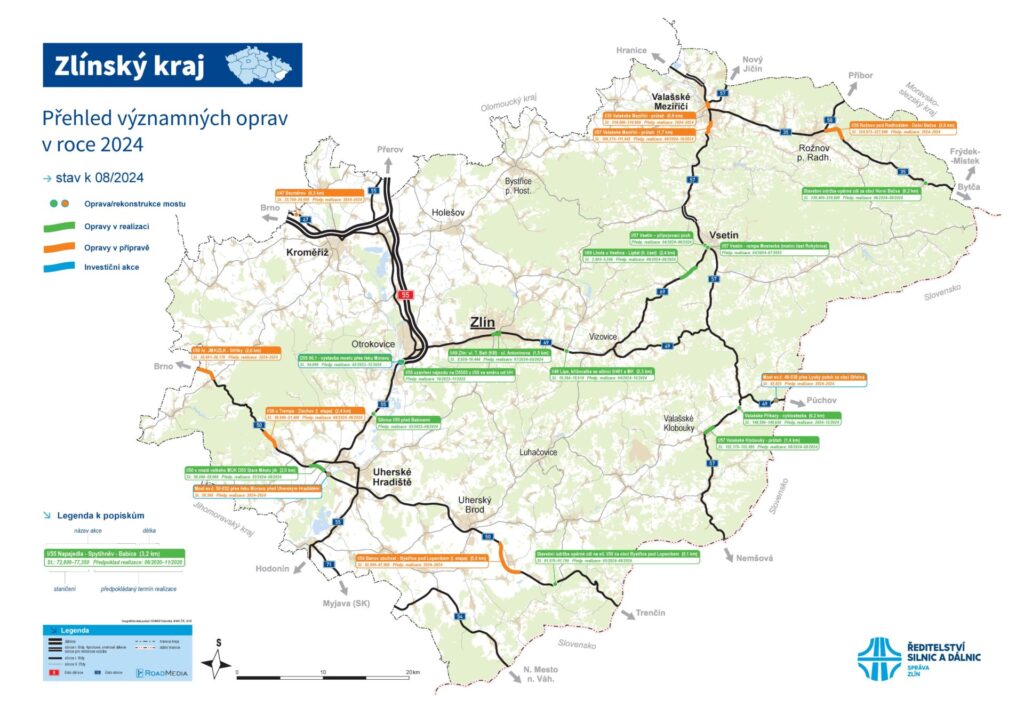 Opět si můžete prohlédnout aktualizovaný přehled realizovaných a připravovaných oprav na území Zlínského kraje. V září plánujeme zahájení prací na silnici I/50 v úseku od hranic Jihomoravského kraje po obec Střílky a v úseku od občerstvení u Trampa po Zlechov. Během září předpokládáme také zahájení opravy vozovky v centru Valašského Meziříčí. O zahájení všech akcí a souvisejícím dopravním omezení vás budeme včas informovat.