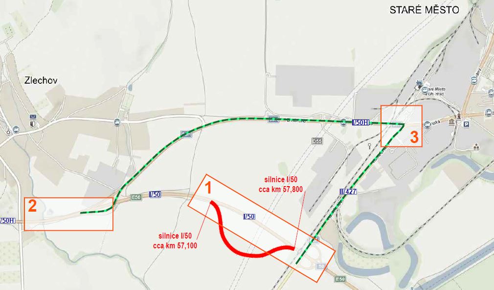 Už měsíc intenzivně probíhá stavba nového úseku dálnice D55 Babice – Staré Město. Aktuálně budujeme napojení na silnici I/50 za Starým Městem v km 57,1 -57,8. Zde je silnice I/50 částečně uzavřena ve směru na Uherské Hradiště. Jednosměrná objízdná trasa vede po silnici I/50 H – ulici Brněnská a po komunikaci II/427, ulici Kostelanská. Ve směru z Uherského Hradiště je pracovní úsek jednosměrně průjezdný. Omezení bude platit zhruba 4 měsíce. Děkujeme za trpělivost.