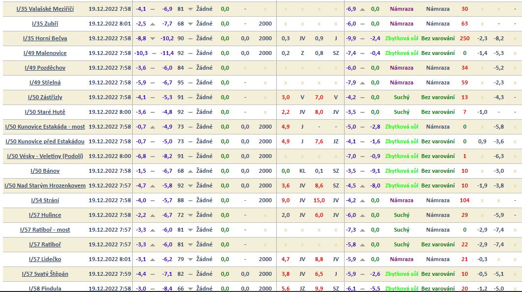 Většina meteostanic ve Zlínském kraji aktuálně nehlásí komplikace v souvislosti se sjízdností dálnic a silnic I. třídy. Vozovky jsou většinou promrzlé, suché a po chemickém ošetření. POZOR však na riziko namrzání viz přehled níže. Vzhledem k výstrahám Českého hydrometeorologického ústavu doporučujeme zvýšenou opatrnost.