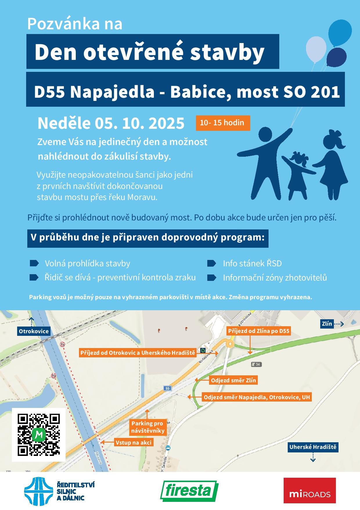 Součástí akce bude volná prohlídka mostu, informační zóny zhotovitele a připravena je také bezplatná kontrola zraku v rámci kampaně Řidič se dívá. Parkování je zajištěno na vyhrazeném parkovišti na dosud nezprovozněné části dálnice D55 před mostem. Podrobnosti naleznete v přiloženém plánku.