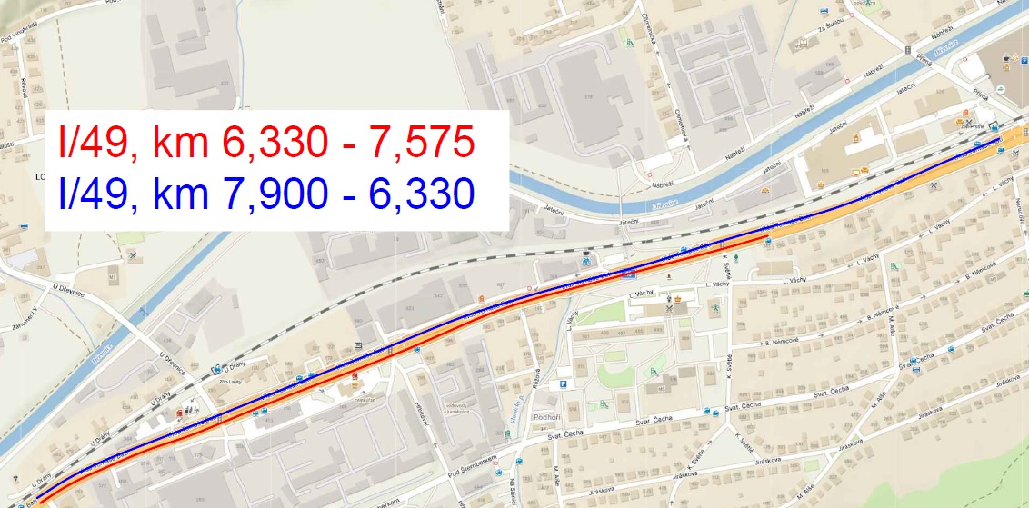 Opravu dalšího úseku silnice I/49 ve Zlíně letos plánujeme během letních prázdnin. Půjde o dva různě dlouhé úseky v obou směrech mezi odbočkou do Prštného po ulici Pod Štenberkem viz mapka níže. Provoz bude zachován vždy obousměrně ve zúžených jízdních pruzích. Podrobnosti upřesníme před zahájením akce.
