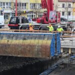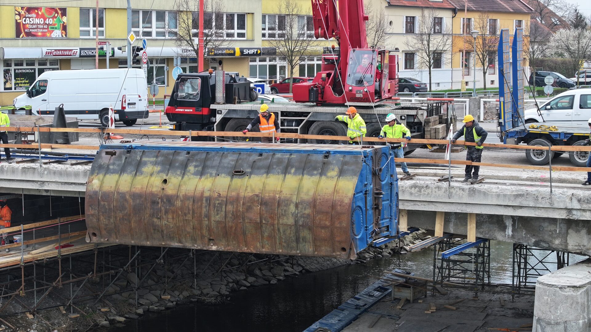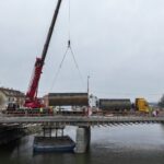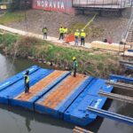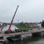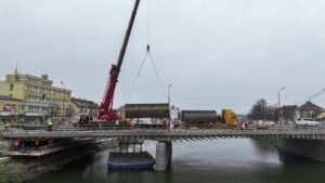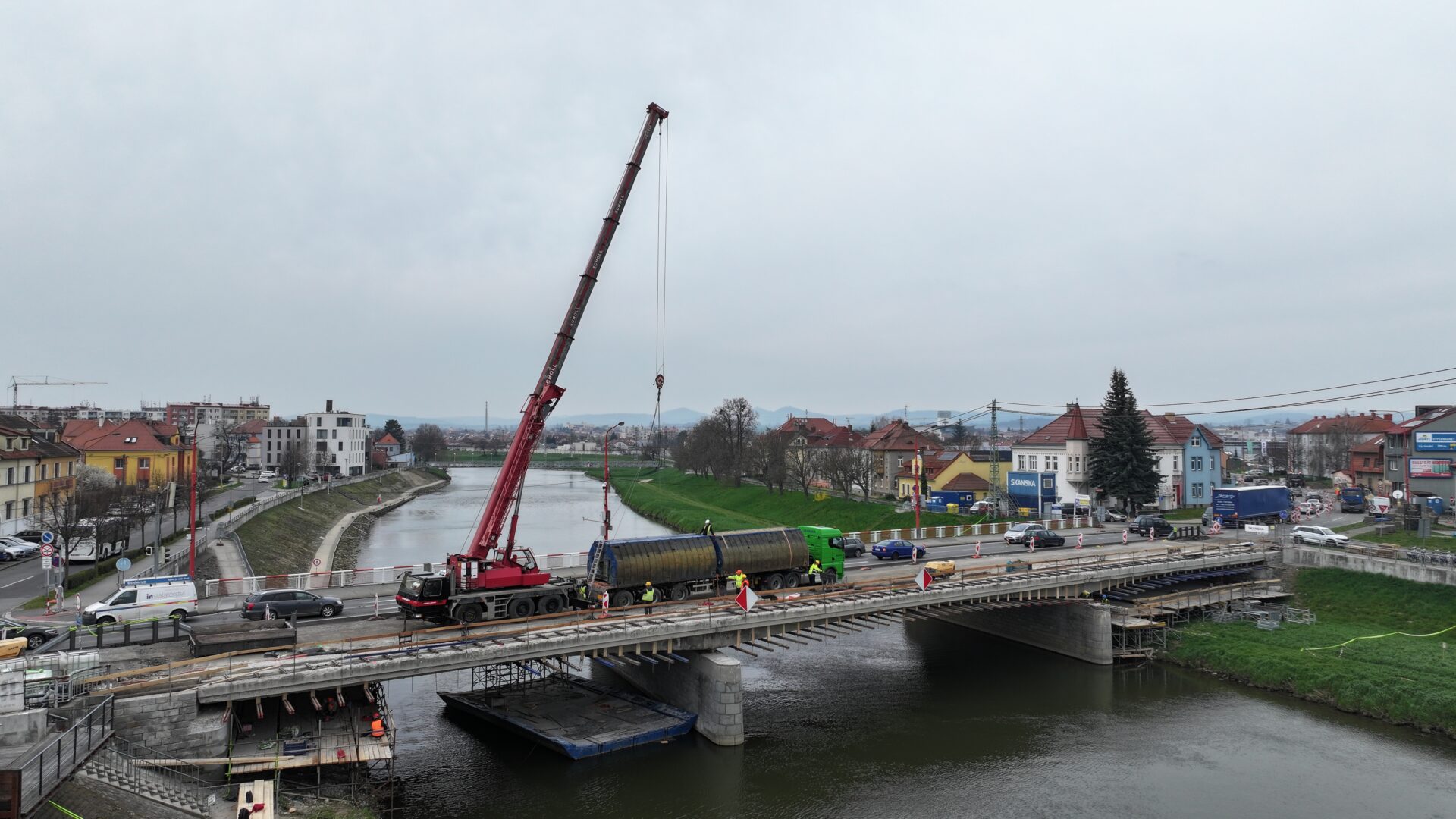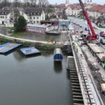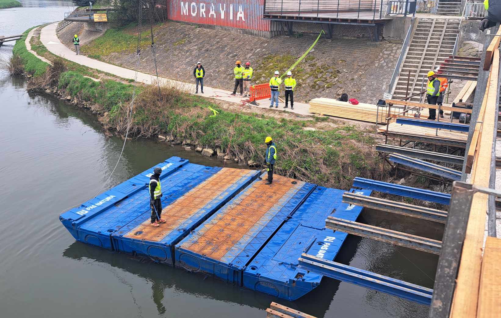 Oprava mostu J. A. Bati v Uherském Hradišti se dnes posouvá do další etapy, kdy přicházejí na řadu práce ze speciálních pontonů ukotvených na hladině řeky Moravy. Aktuálně je na mostu umístěn jeřáb, který pontony o rozměrech 6 x 8 metrů snáší na řeku.