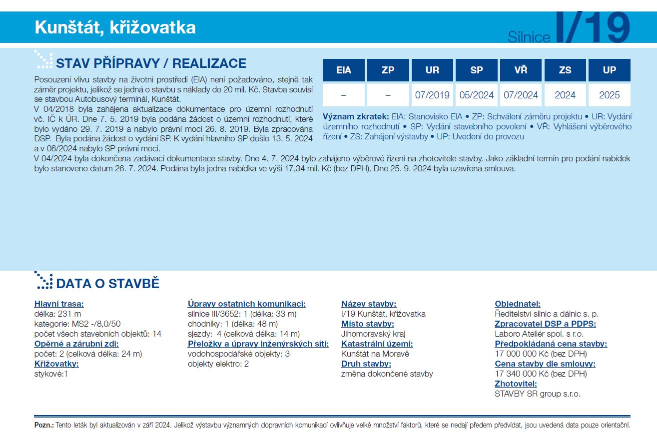 Zásadní úpravu křižovatky silnic I/19 a III/3652 v Kunštátu zahájíme v úterý 8. října. Provoz bude veden kyvadlově a řídit ho budou semafory či pracovníci s vysílačkami. Práce máme rozdělené na dvě etapy. Letošní první etapa potrvá 50 dnů a dokončíme ji v listopadu. V příštím roce na jaře stavbu opět zahájíme a finálně dokončíme za 80 dnů. Akce vyjde na 17,3 milionů korun bez DPH.