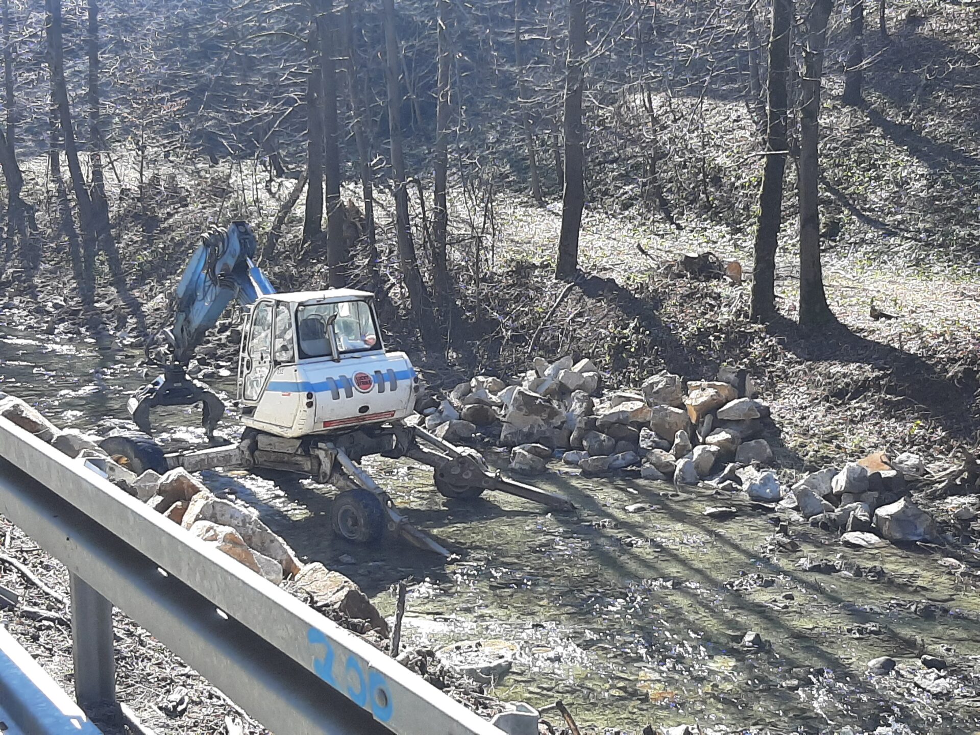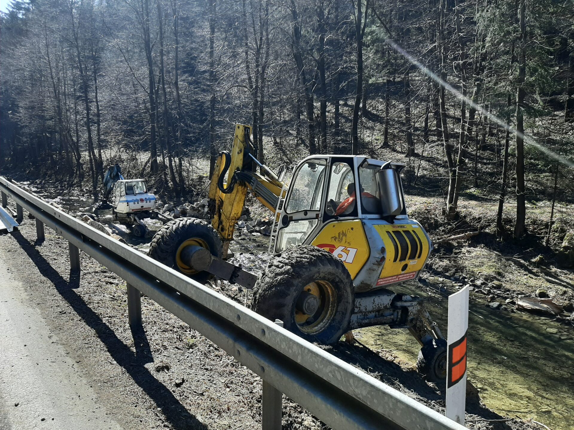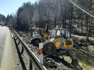 Na silnici I/57 před obcí Lidečko stále řešíme zajištění svahu proti sesuvu. Rychlost je omezena na 50 km/h. Už jsme vykáceli stromy a zpevňujeme břeh. Zatím vše bez výrazného omezení dopravy, kromě snížení rychlosti.