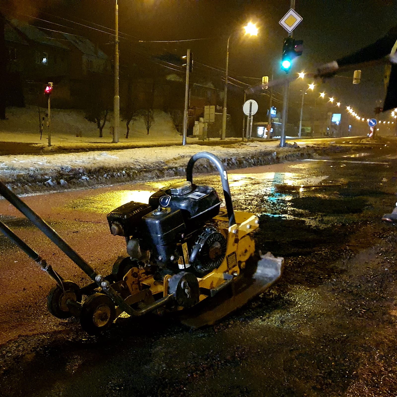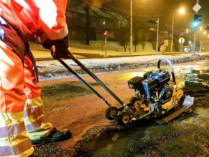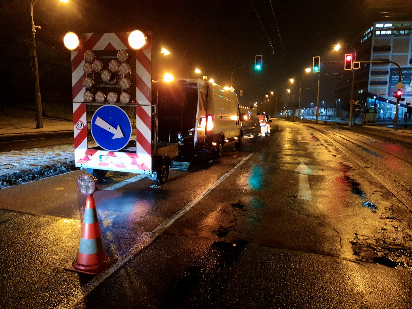 Výtluky na frekventované komunikaci I/49 ve směru ze Zlína v odbočce do Prštného jsme provizorně opravili studenou balenou směsí včera ve večerních hodinách, kdy byl menší provoz. Jedná se o velmi vytíženou křižovatku, kde povrch vozovky poškozují zejména nákladní automobily při brždění. Finální opravu chystáme na jaře za příznivějších klimatických podmínek.